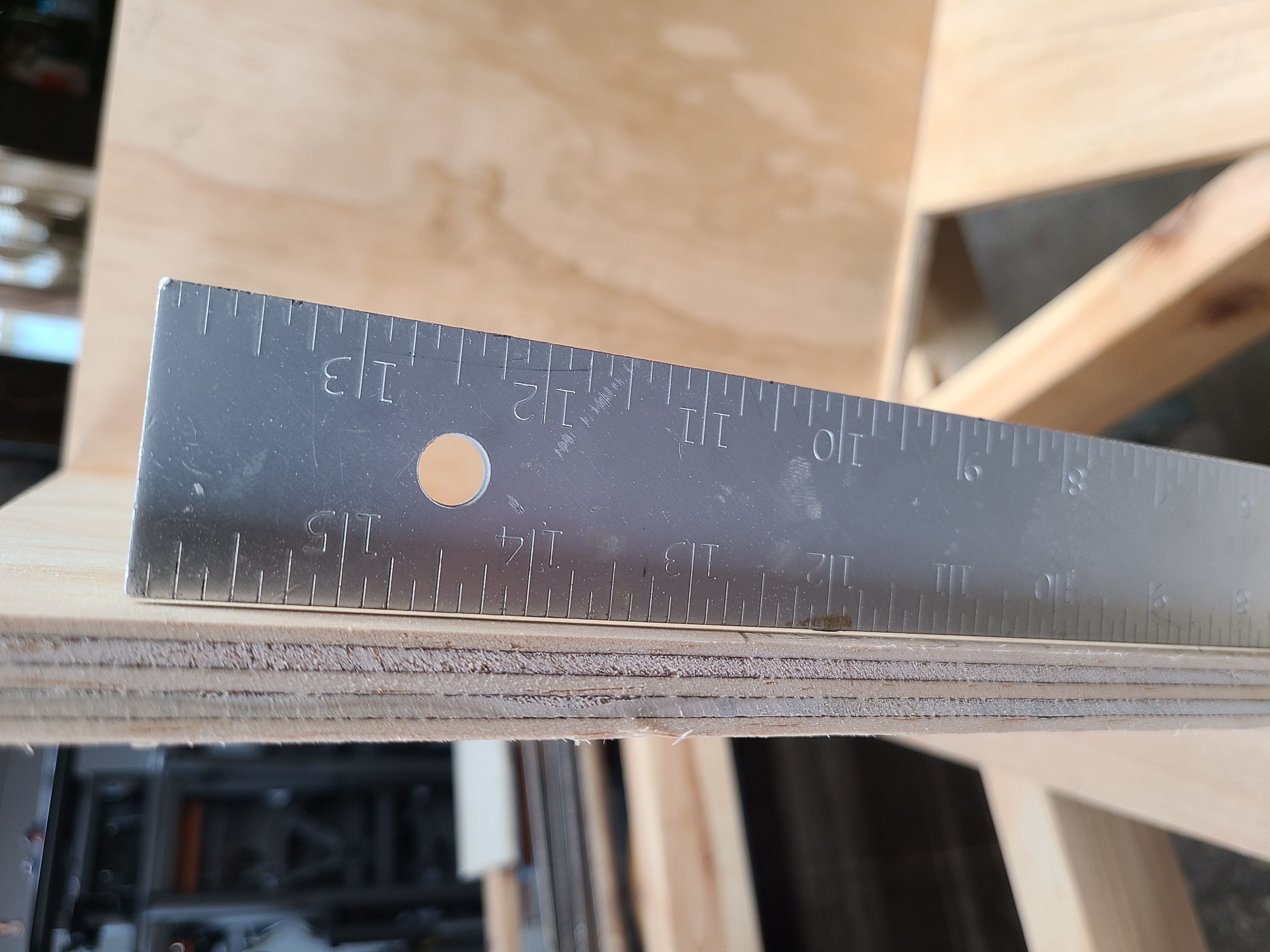 Well it's more plumb now. I do feel like things are lining up very well compared to a Titan or THT build. Maybe I'm more suited to small builds. Maye I'll try a T30 next. I guess I left every panel a fuzz long, maybe 1/16" or so and maybe that accounts for the 15/32 thickness? After all, my CAD model is 1/2" nominal and laid out that way. Anyway, I have panel 3 and 4 on now and some blocks glued in for the screws. I feel like my driver hole was too close to the ends, so I just ran a strip all the way across to thicken it and give me driver screw bite.