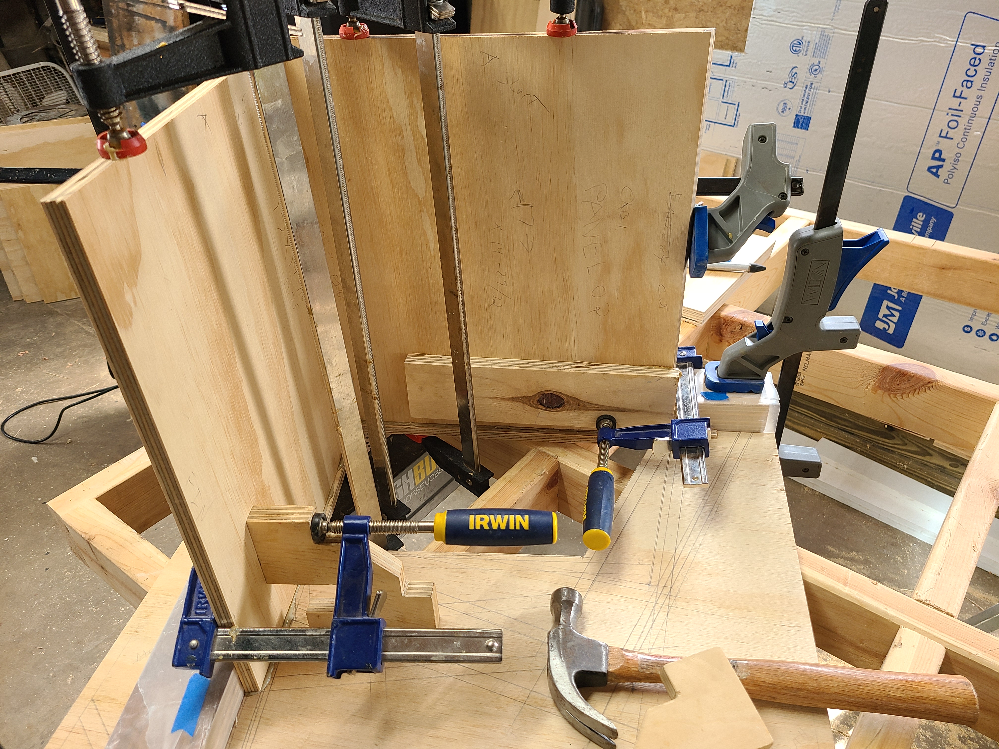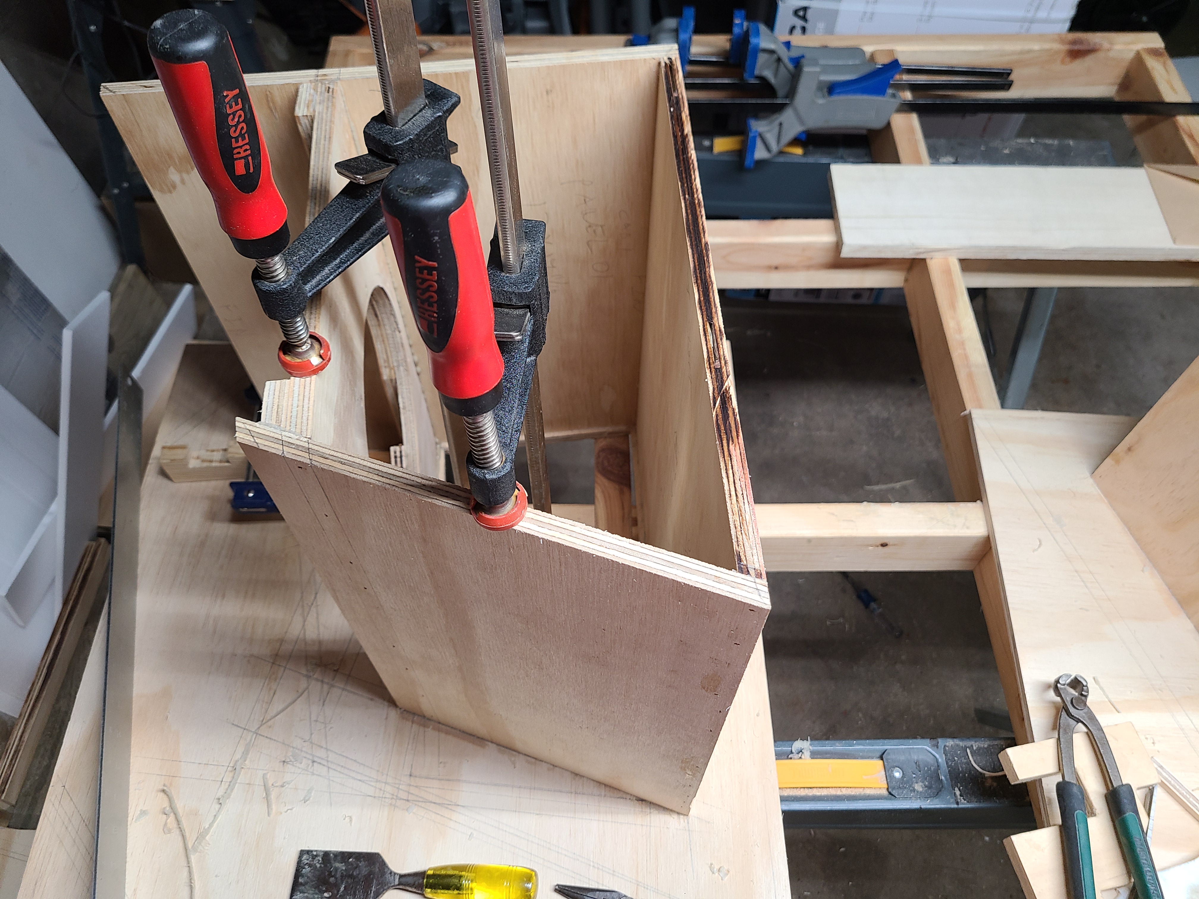 A little more progress, not too many setbacks. I cut panel 3 to panel 6 braces a shade too narrow. I pushed them back a bit but tried to balance a bit of PL expansion vs panel 6 being weird. I'm still cutting each part twice, building both cabs side by side. I'm a 1/16" off on panel 1 at the mouth. the corner is off the line a fuzz and a 1/16 off compared to the plans and my other cab. I'm trying to wrangle it all back inline as I go.