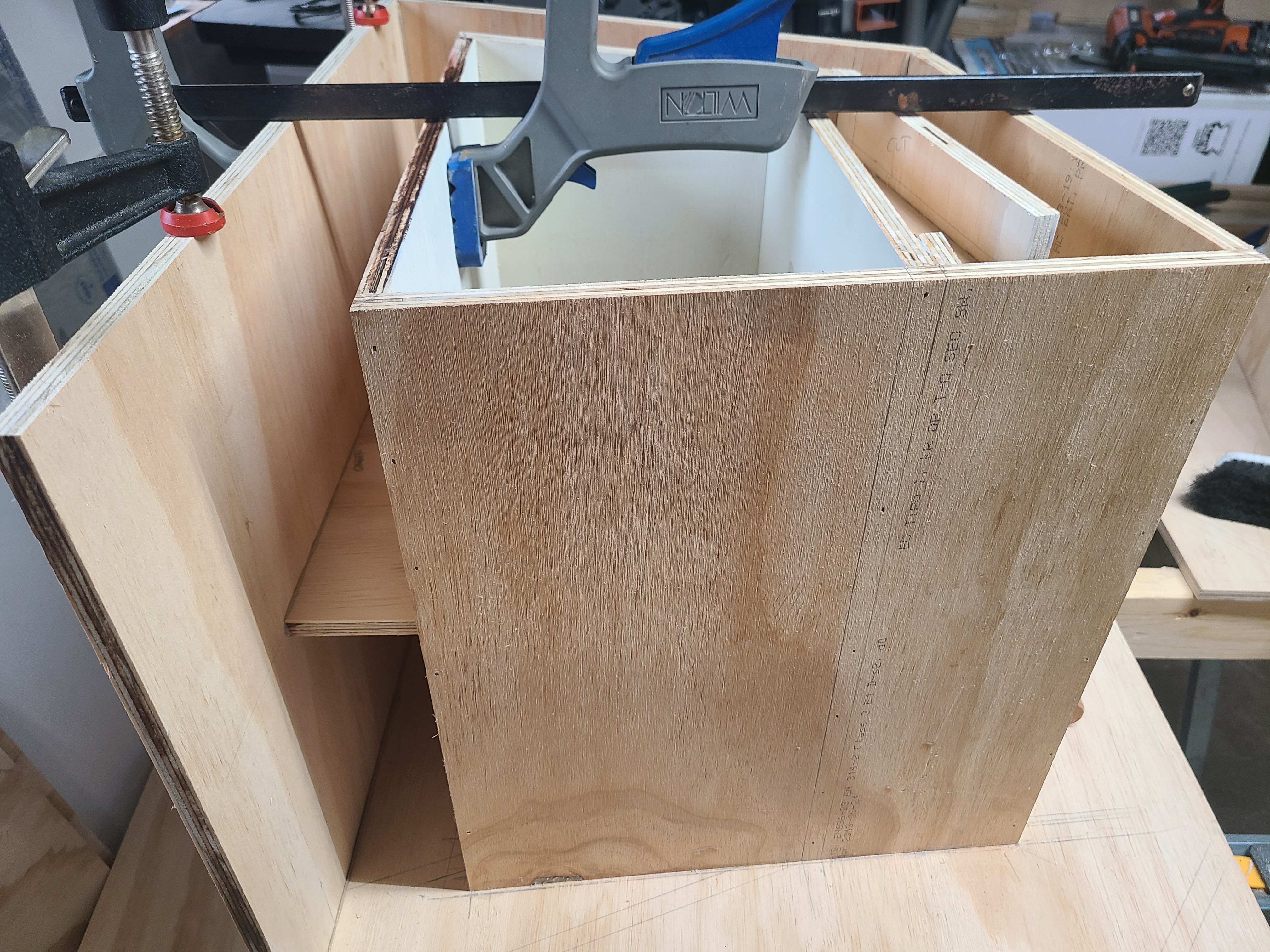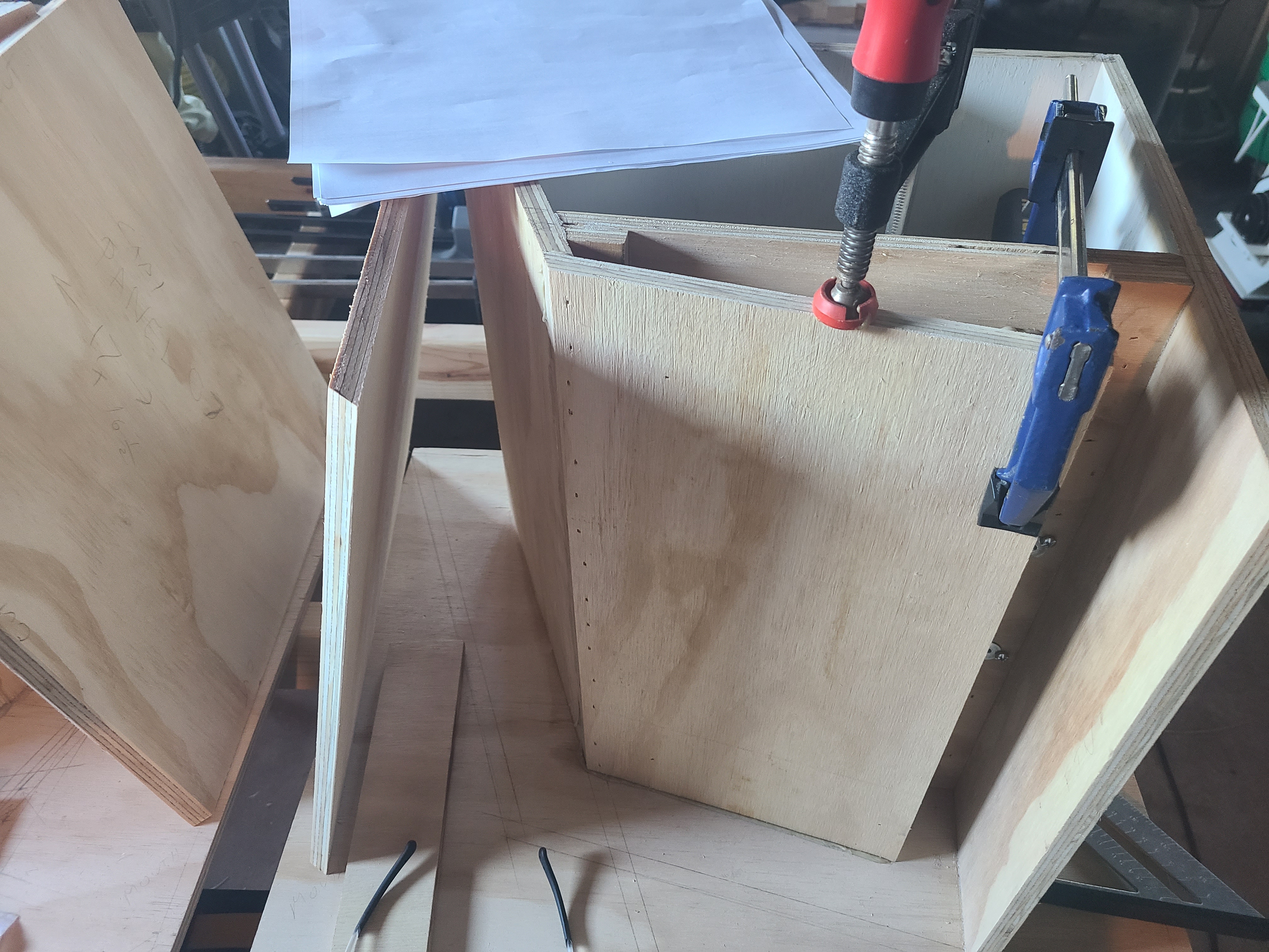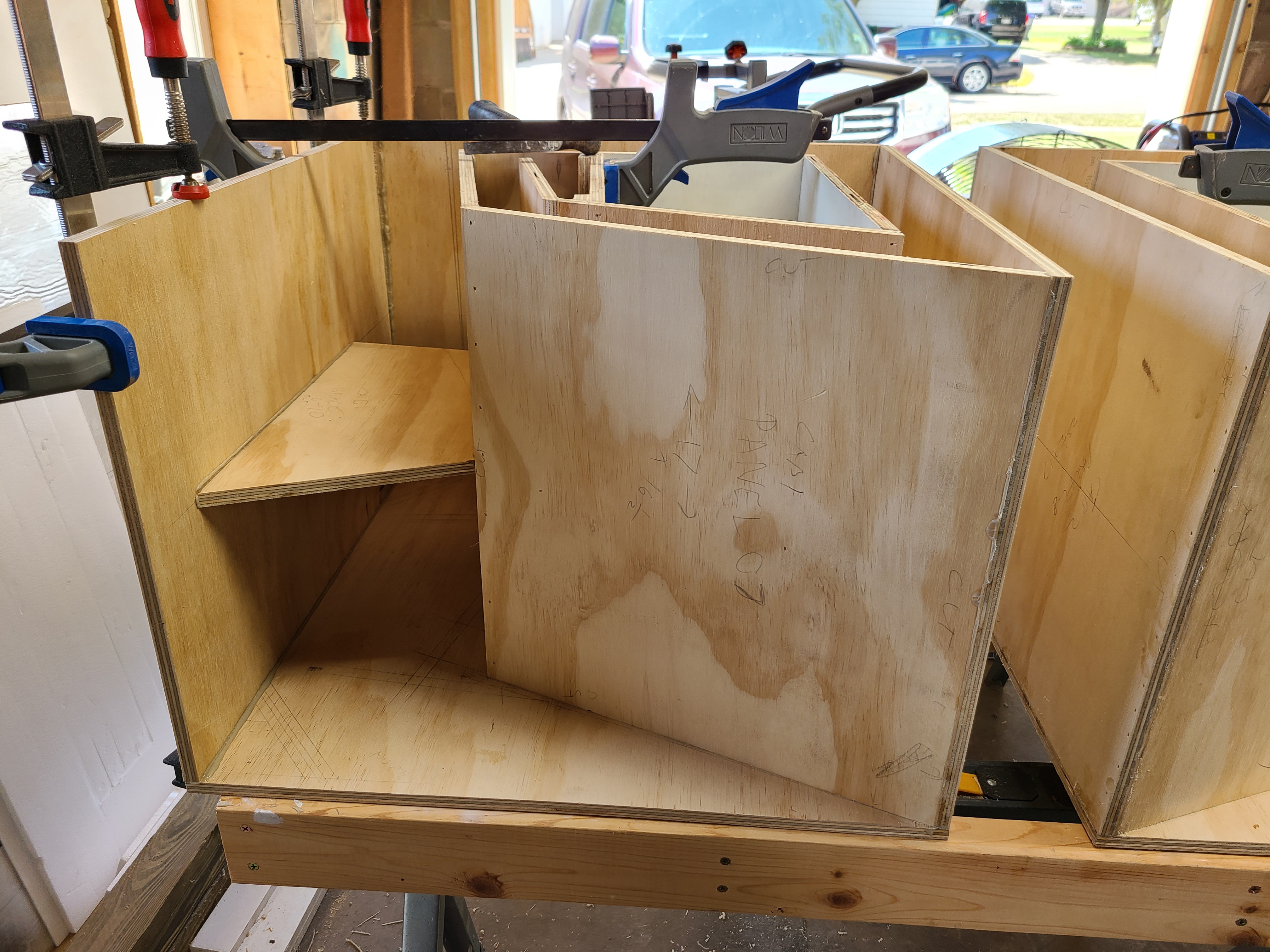 Got the first cab out of clamps and glued second, panels one and two. I had a square on first one, had it within a RCH of plumb. Now that I take the clamps off, she's a 1/16 to 1/8 out at the end. Maybe as I glue the next panels on, those will pull in. I didn't think to check the corner where 1 and 2 meet. I'll check when I unclamp the other in the morning. I also waited about 2 hours and scraped off excess PL with a sharp chisel. I couldn't do the same with cab 2, as I had a laminated 2x4 on one panel to flatten it a bit. Dang that Arauco can spring back when it's cut up!