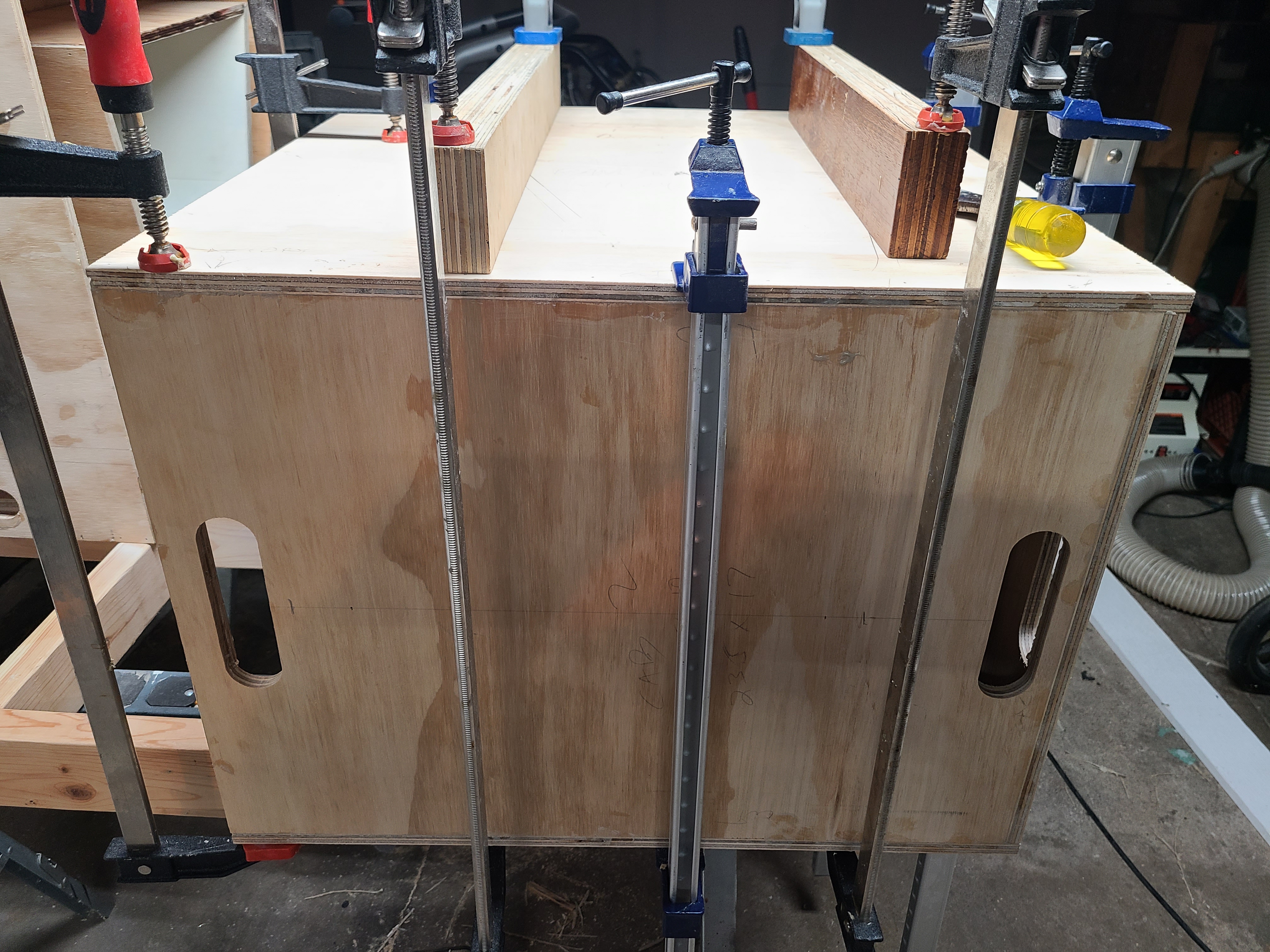 This is a good idea. My first thought is to open up the ply over the T-nut for more wiggle room, I kept 'em pretty snug, like 1 drill size over the #10 screw, and just opened up the 'blocks' enough for the T-nuts to sink in. I'm going to buy a 10-24 tap and clean them all out first. I have two but they are so Harbor Freighty they won't even start in a clean hex nut in my hand.
