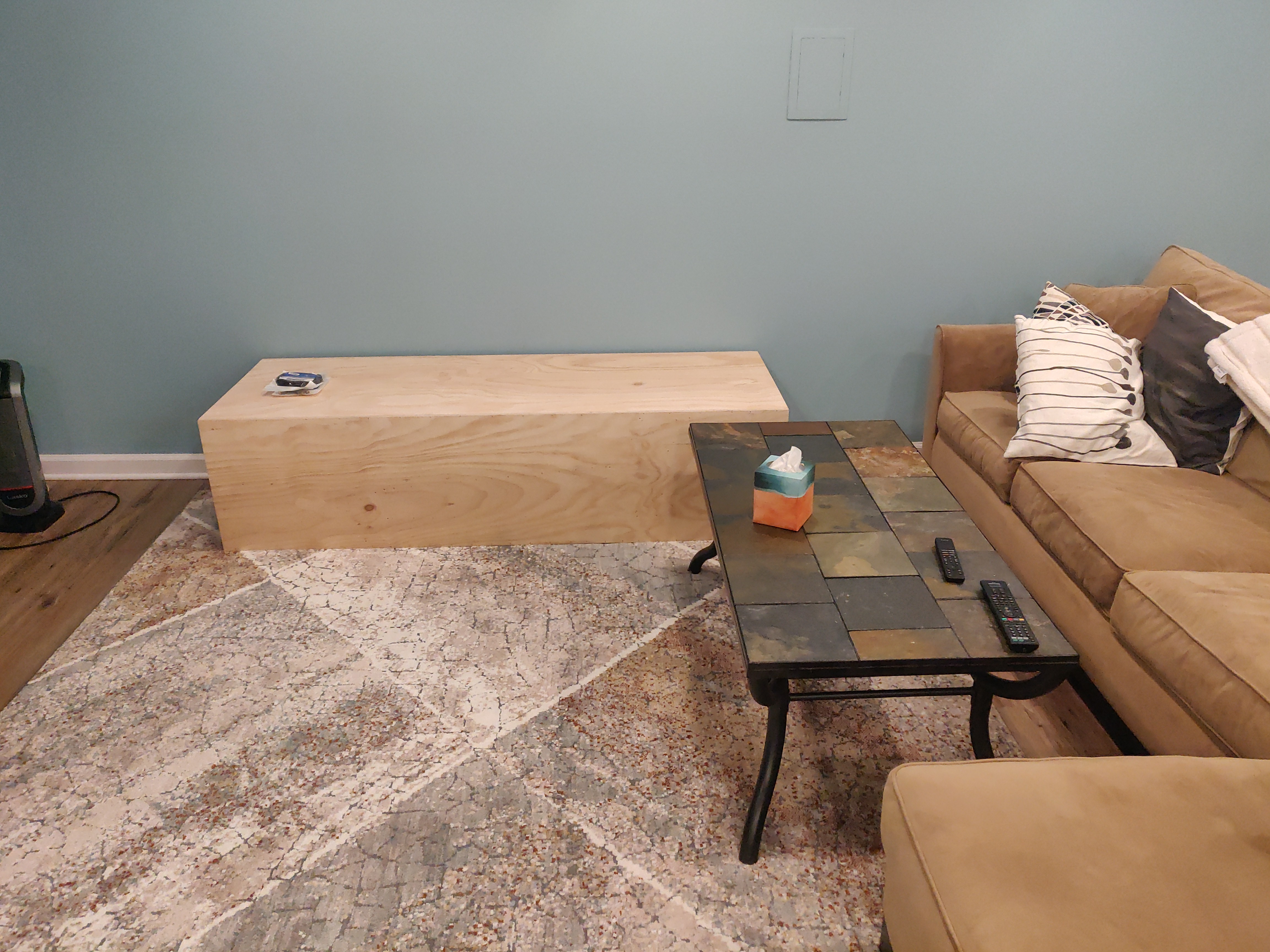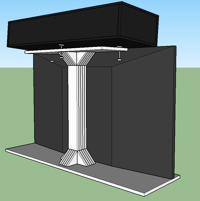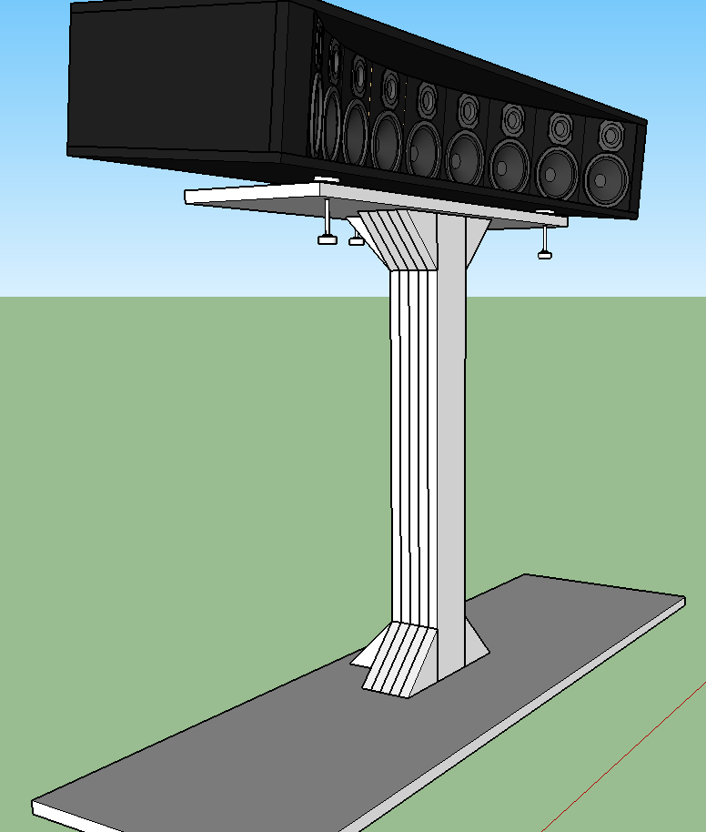 Here's my idea for where to put the center channel and what to put it on. The stand will have adjustable "feet" on the top that I can screw up (pun intended) or down to raise/lower the center channel, level it and angle it downward. The TV will mount to the face of the stand with a standard TV mounting bracket. It'll be made of 3/4 plywood sandwiched together so should be plenty strong.