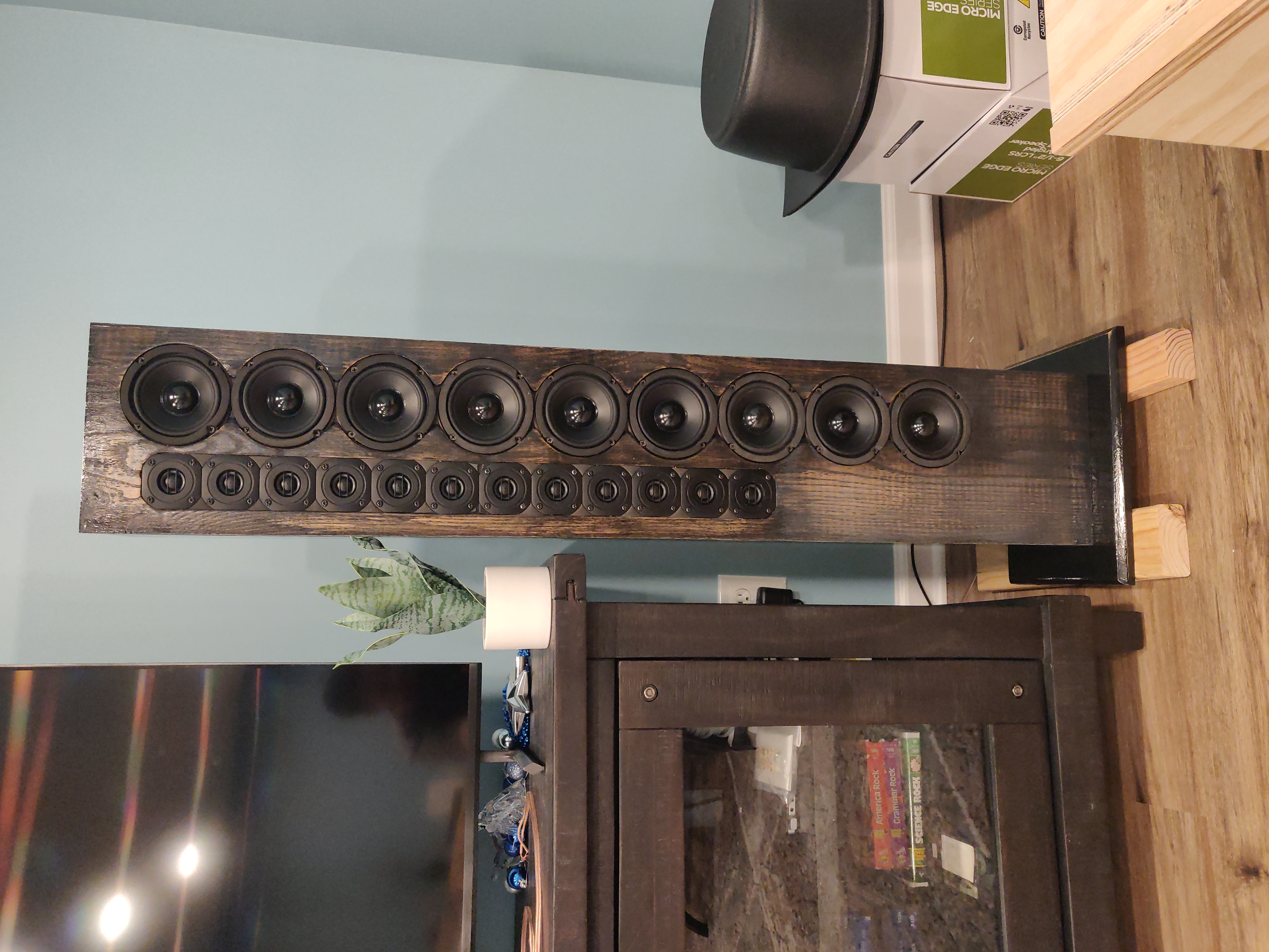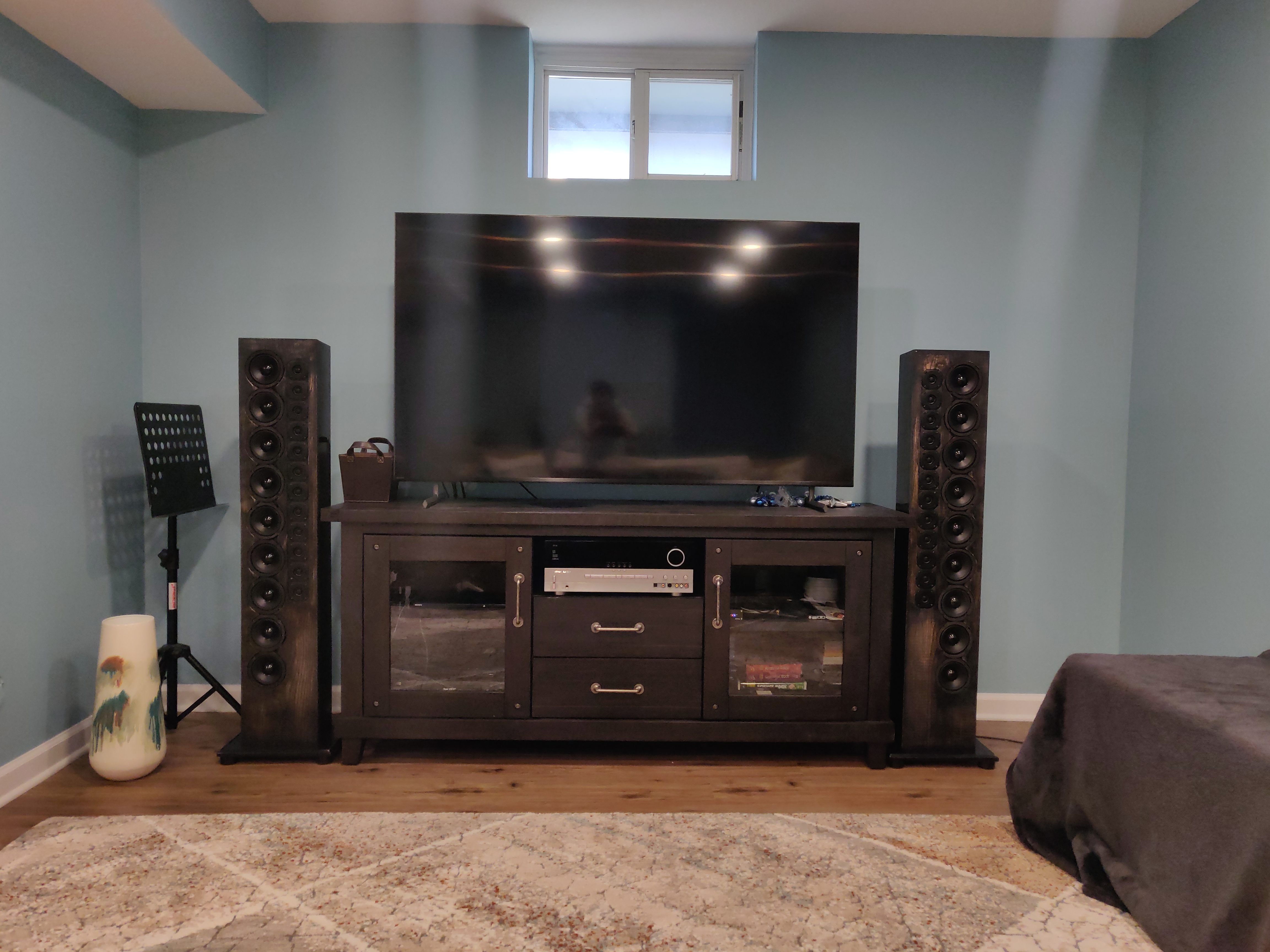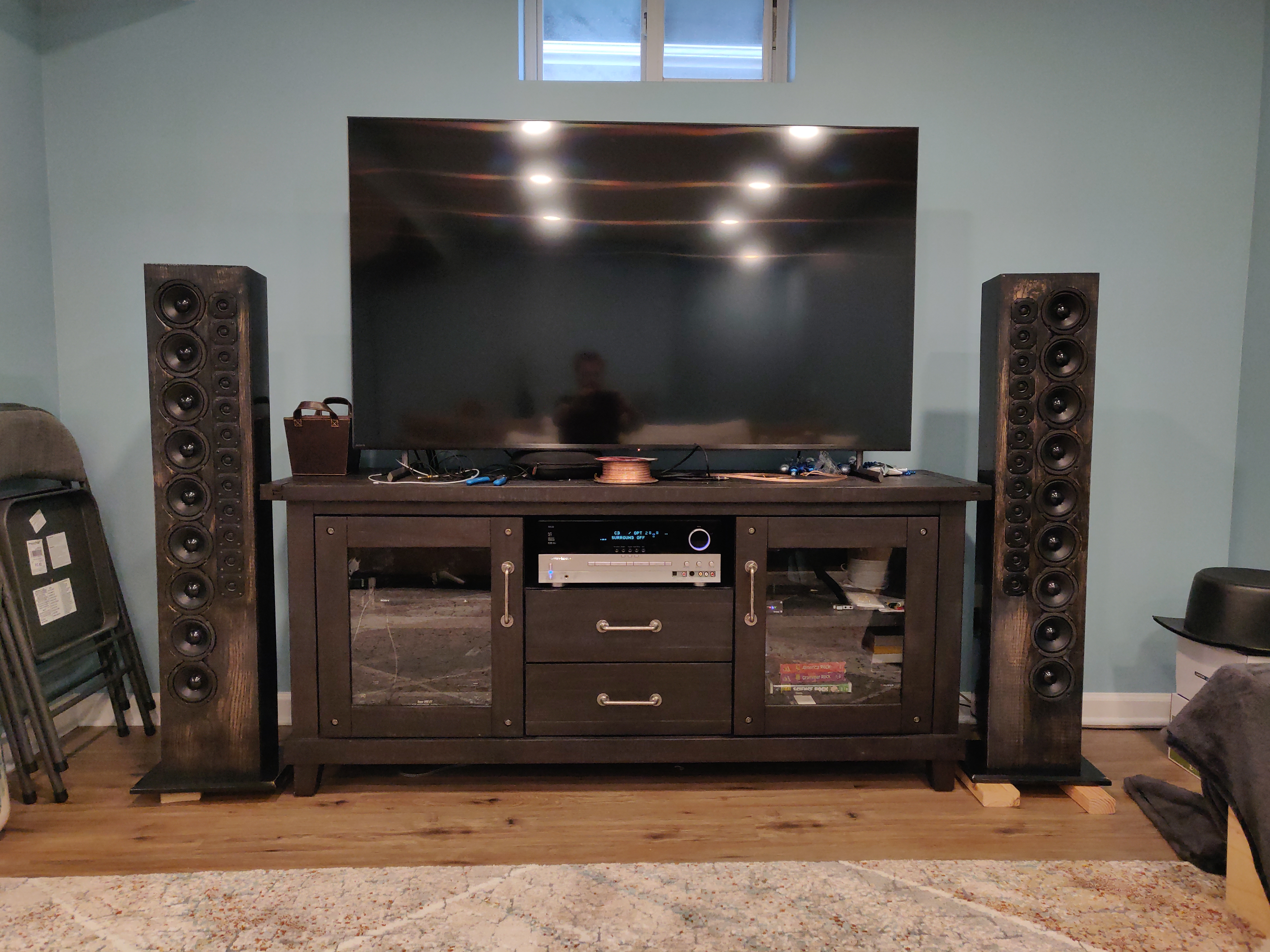 For the center channel, I'm working with the WAF to determine which one to build. Right now, it's a toss up between the 9 driver version above the TV (wife is wary of this option, she says it'll look funny) and the tiny 3" 4-drive version sitting in the slot where the receiver is now. I'm hoping to not go that route as I'm afraid these towers will just drown it out. But it'd be better than the TV speakers. Wife has already "allowed" this much to happen, I don't want to push too hard. :wink: