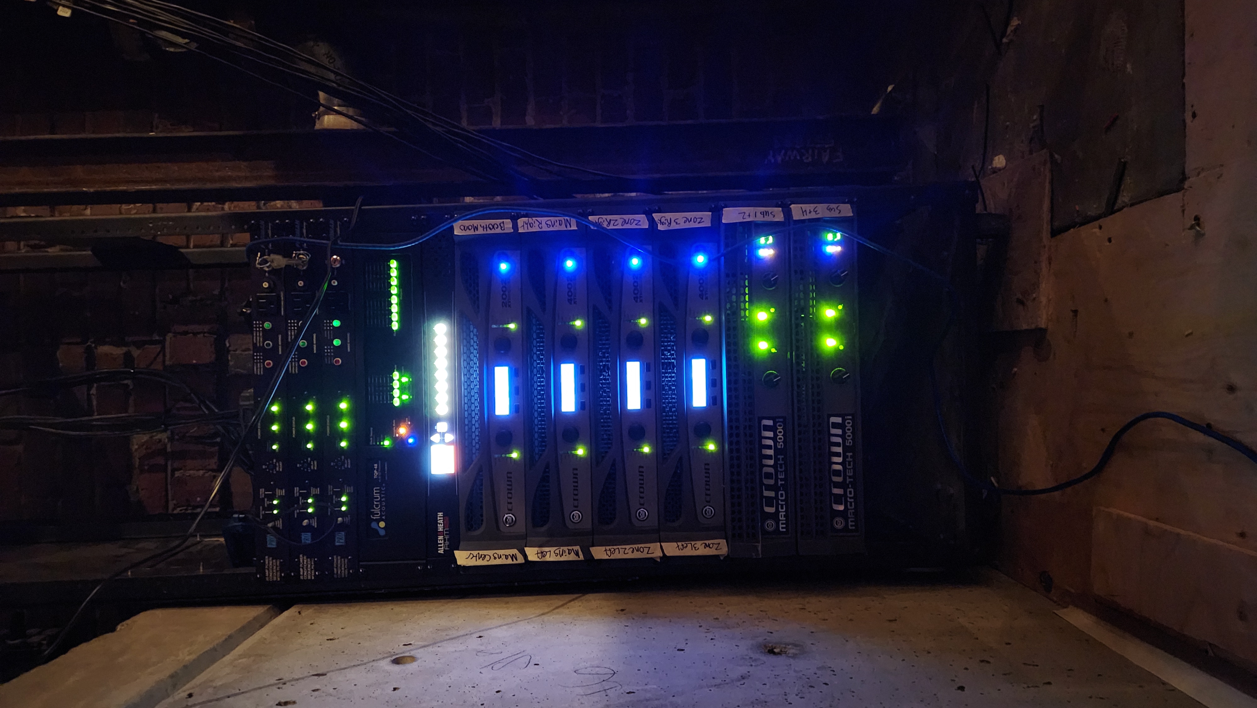 but because I've aux fed and grouped things the way that I have, I have an unbelievable level of control of the djs mic volume on either side of all 4 zones without causing the house techs too much grief. You know how djs are with pointing the mic all over the place. Plus this means with quick programmable preset buttons on the AHM that I can quickly reorient the room for comedy nights with one button. Anyways in the meantime here's the rack.