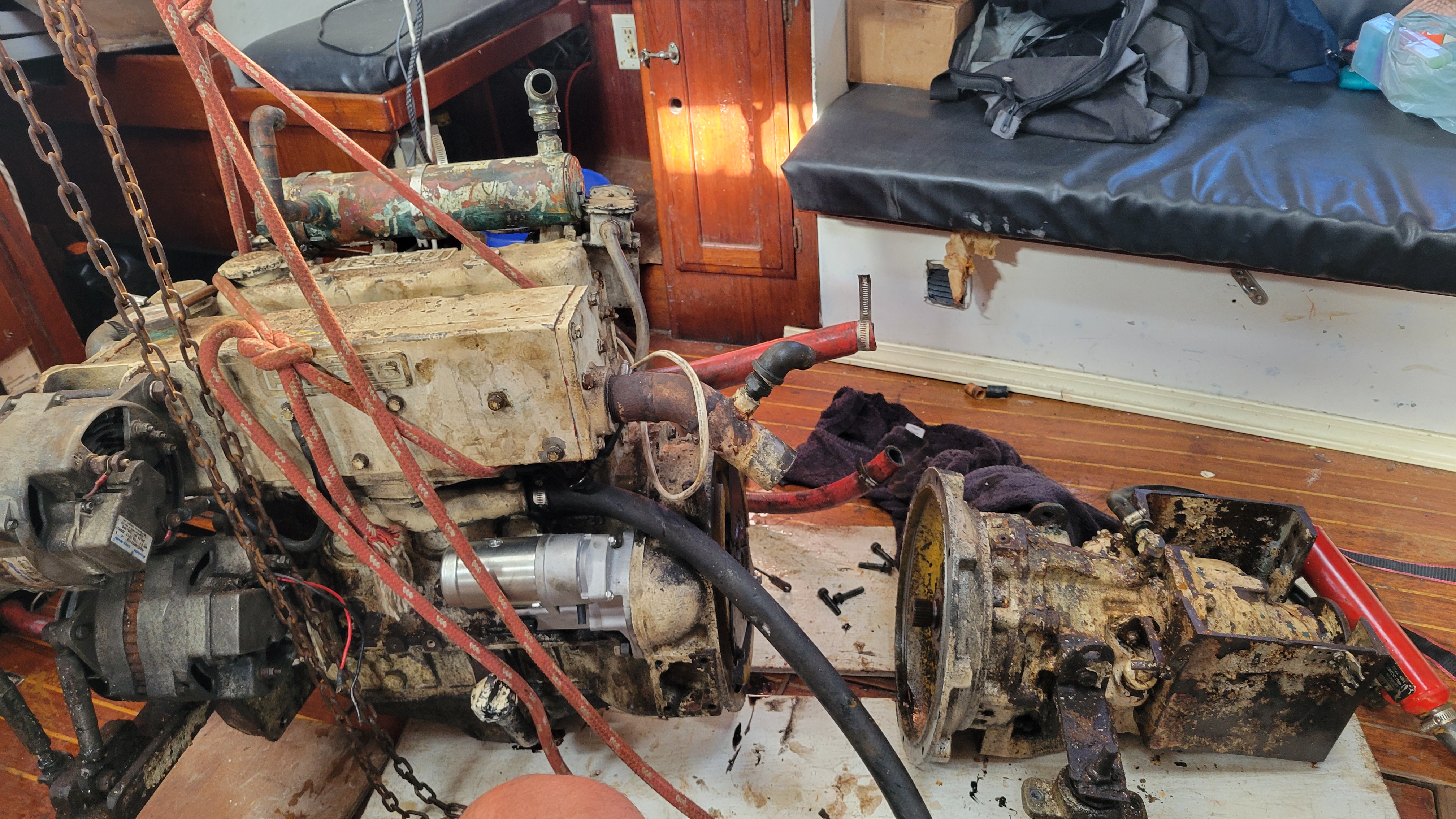You're absolutely right! I did put a new starter on. And good call on the alternator situation too. If you look closely, there are two large frame, 200 amp alternators on the engine. The boat also came with a spare. The amount of spare parts this boat came with is impressive. The first engine pull to replace the transmission input shaft seal... didn't even have to go to the store once. Gasket and seal kit already onboard, as well as the chain-fall hoist, and everything else. I mean, how many projects have I had that didn't require at least 3 runs to the store? None before now, I'd wager. Even that throttle cable that broke... "hey, go look under the bed in the aft cabin".
