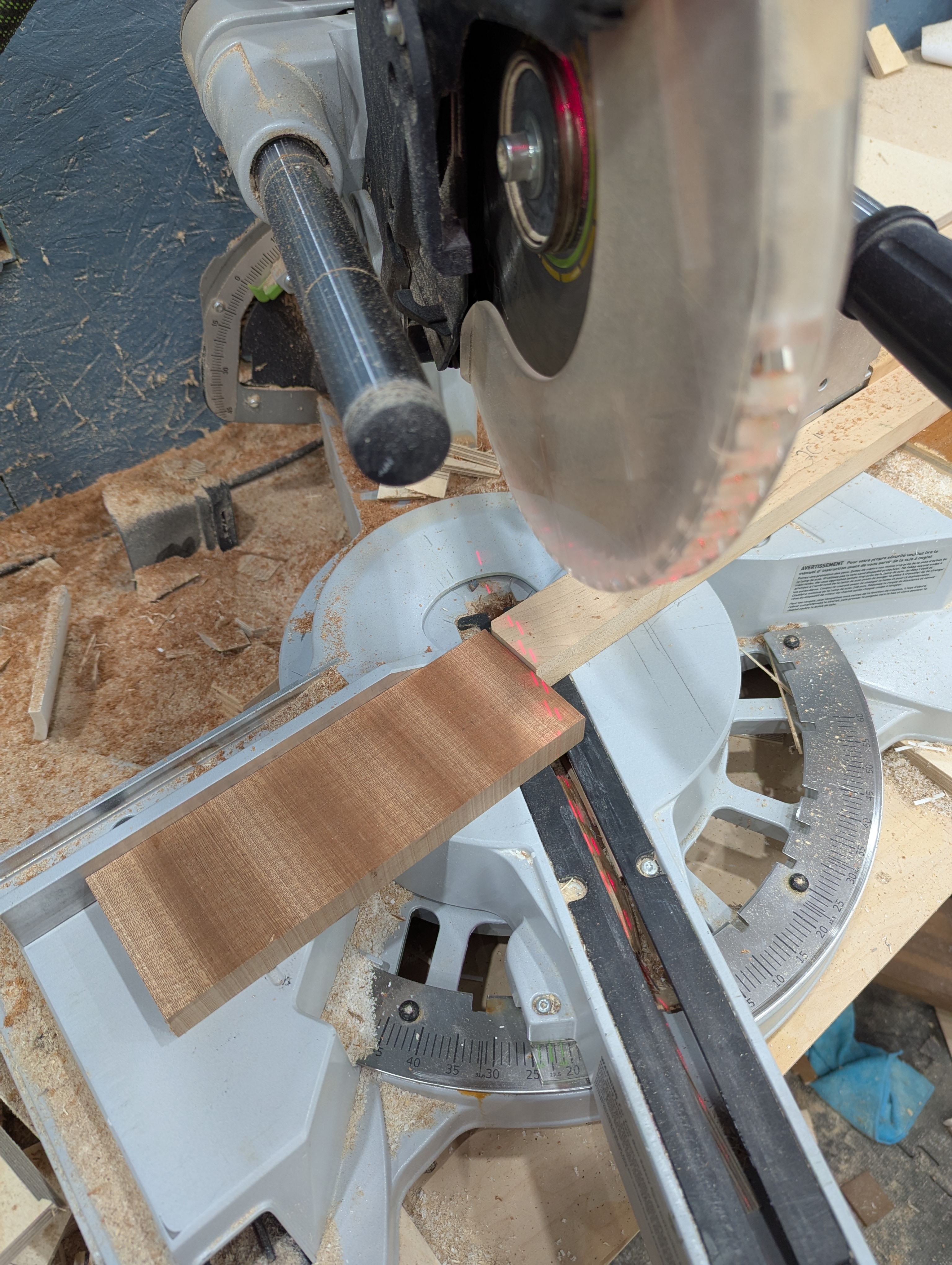 Time for nacelles. I made easy work of these on the miter saw again. Set up a stop and cut on the angle. Again, short on the pictures to show exactly what I did. Made from scrap Utile quarter sawn Utile