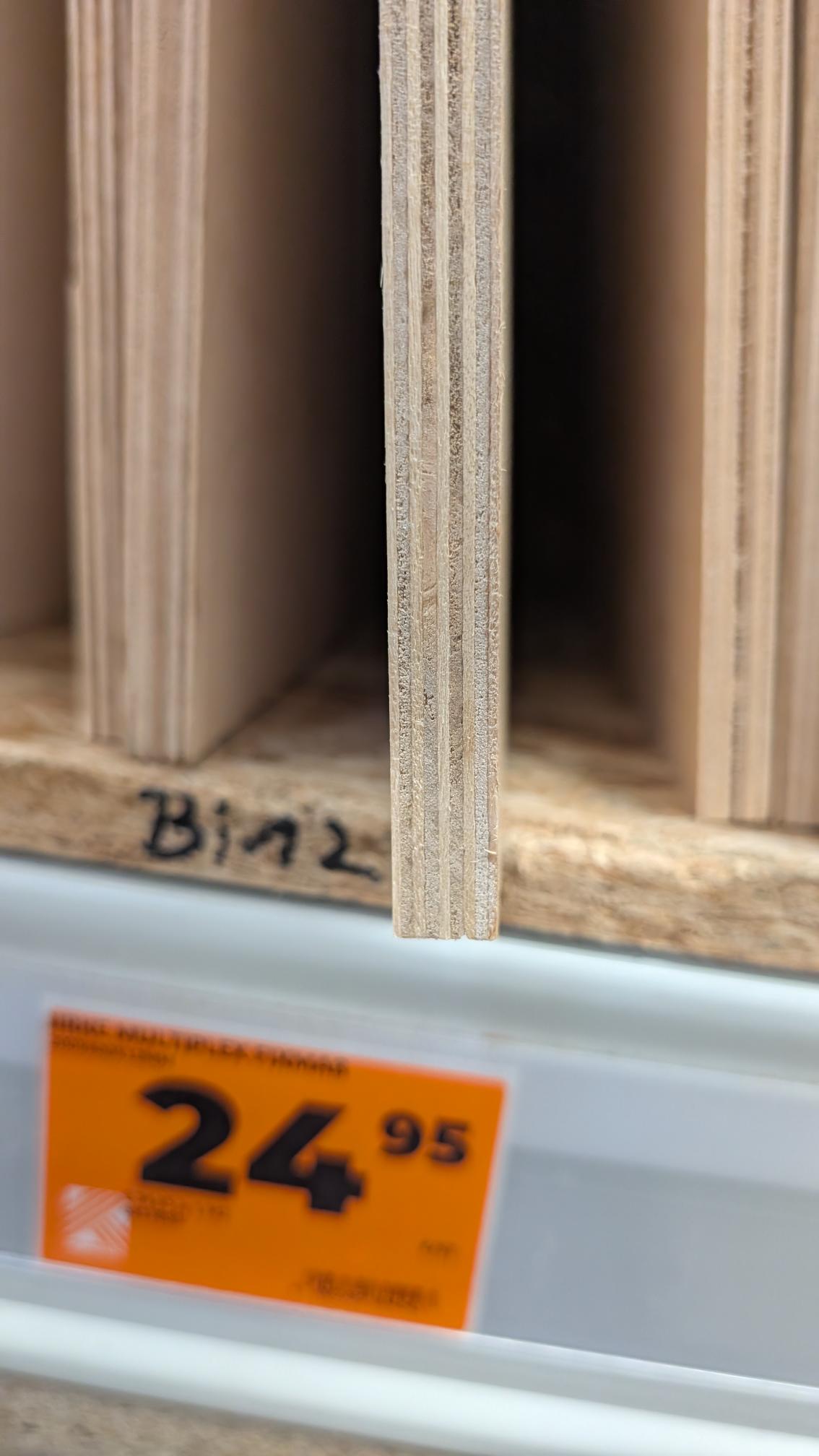 We have the BalticBirch, which is commonly made from 9 Plies in the desired thickness of 12mm, then some poplar with the problematic thin veneer as the toppings around 7 "real plies", and then some interesting poplar/eucalyptus with 7 plies: (And without a picture, the construction pine as well. But not a good idea) The pricing on them, when bought at reasonable sources, is about 106,36 €/sheet (4 by 8 feet, or 1250 by 2500mm) for baltic birch, and 72,23€/sheet (1220 by 2500mm) for the poplar/eucalyptus-combination (30mm smaller, but not crucial for cuttings i tried to arrange). Poplar with thin outer veneer comes at quite similar prices, but not worth it. As well as construction grade pine, all within the same range when not buying in huge bulks.