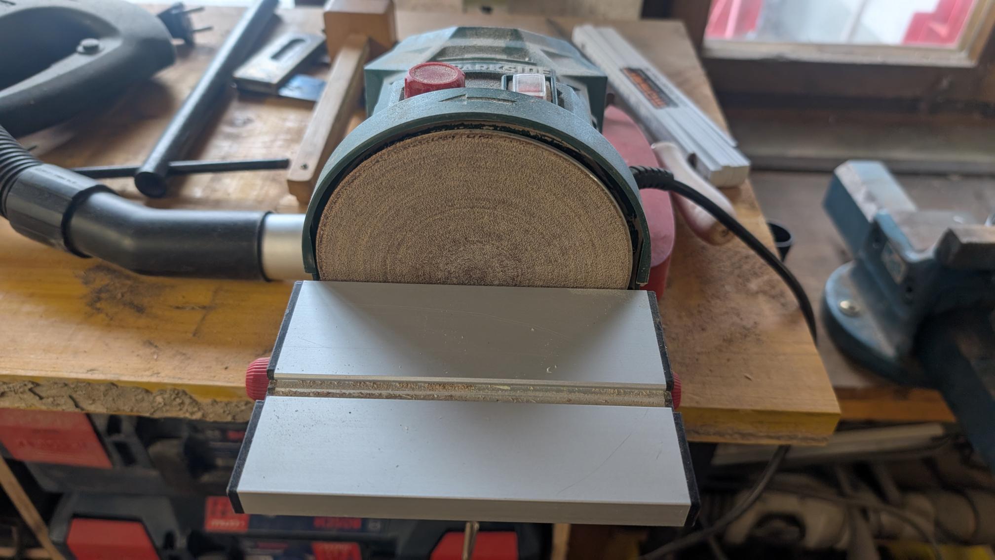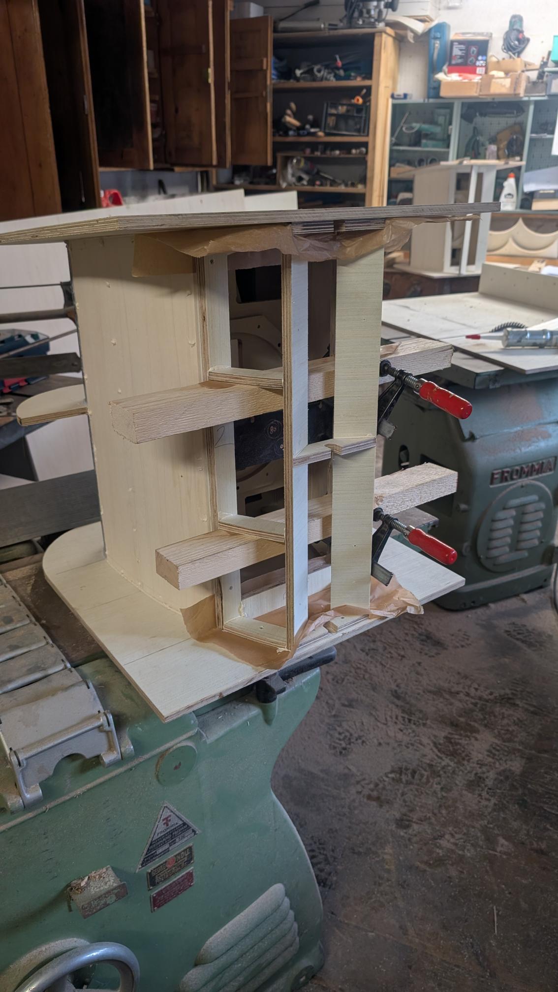 The middleparts, very tiny indeed, worked best clamped together. These little pieces annoyed the crap out of me. But it came in handy, to just make one to size, check fit on the cab, take that as a preset, cut it roughly by hand and sand it down until it fits.: Cutting roughly Stationary Disksander i found in the shelves did really well on that. Glue setting like that, yesterday. Today the walls are next, and then sanding of all the interieur.