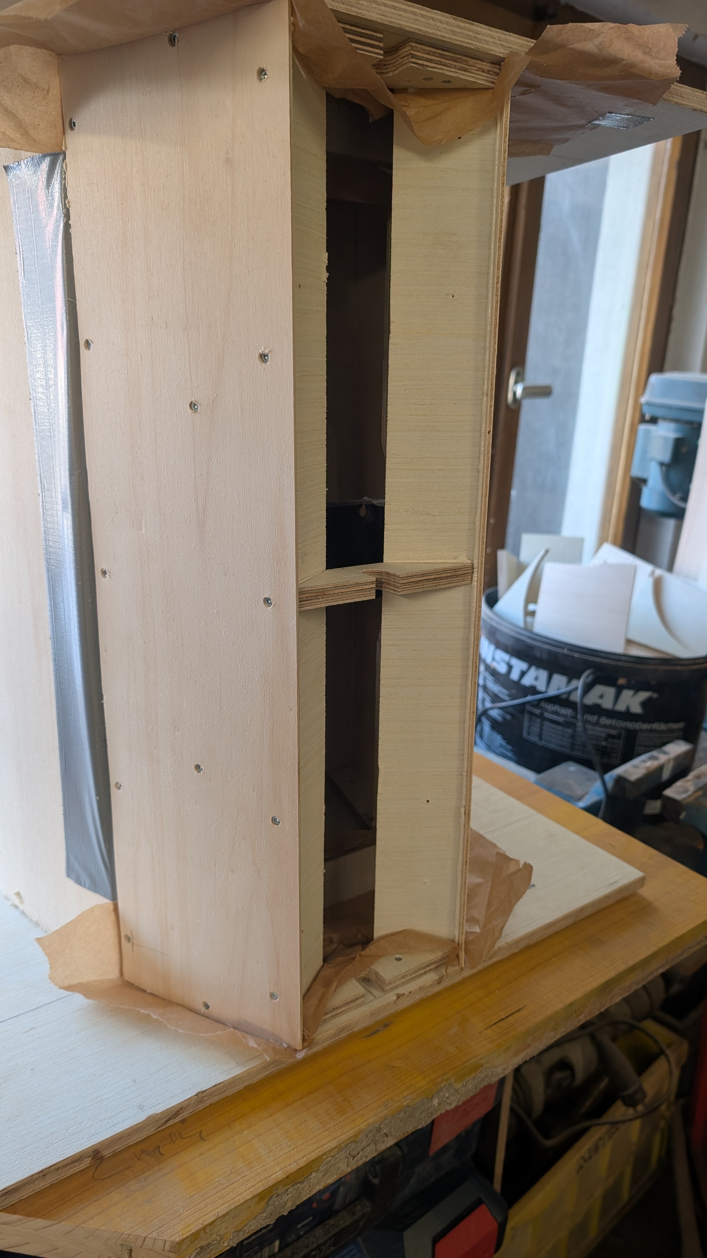 Back to the DRs; weather just way to cold here to get something done that creates dust and can't be done in the living room. So i went over and removed alll the screws and filled the holes. Package full again, and cab blank now and just holding by the glue. Seems to be fine, nothing moved. Hand full of screws will stay on it, but those were handy little helpers so far (and way smaller than clamping).