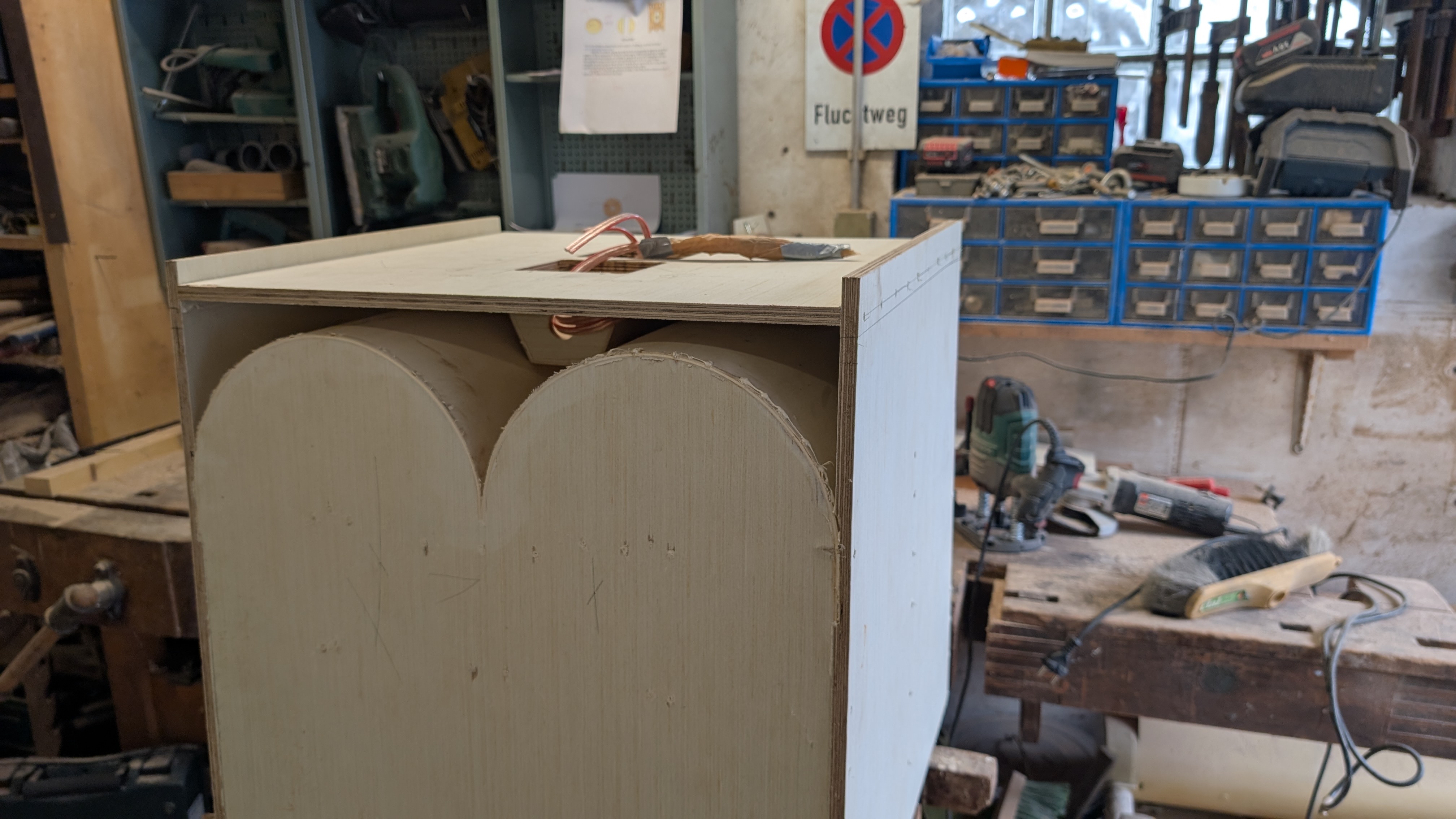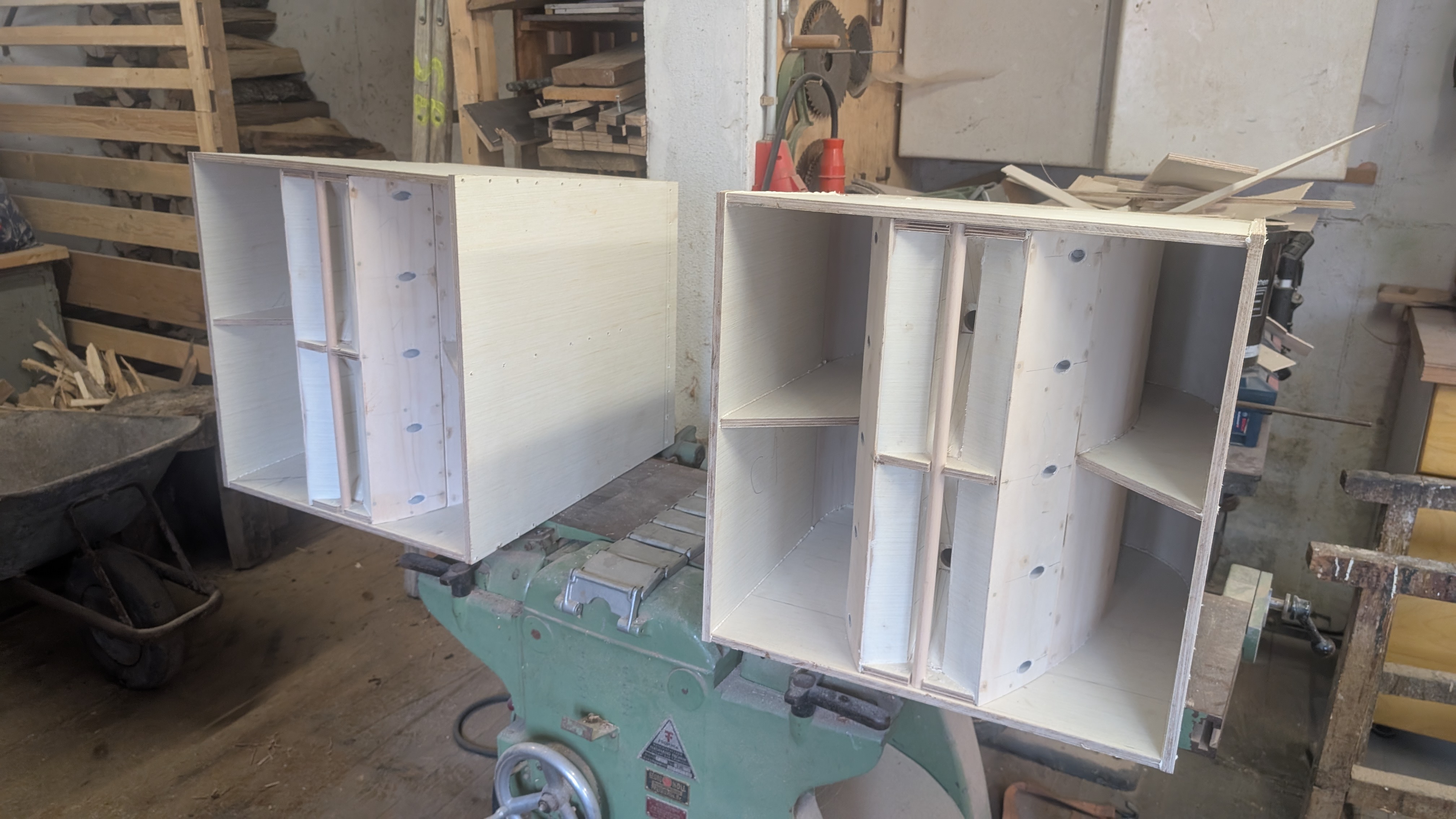 To the stacking/fixing part: i thought about little wooden clamps, that go to the front corners, to attach two cabs on top of each other. They could be fixed in the sides with T-nuts/screws. Just little pieces with slits for the side walls and the top/bottom that touch. First i would assume i will do them to be angled together, so pressed to each other front and back. Could do clamps for every angle i need, and in the back i could strap them together from the centered handle (and strap them down from the same handle OR the side handles in the corner). Would be way smaller than the full side brackets. The bottom needs to stand angled then, but i got an idea for that combined with the v-plate.