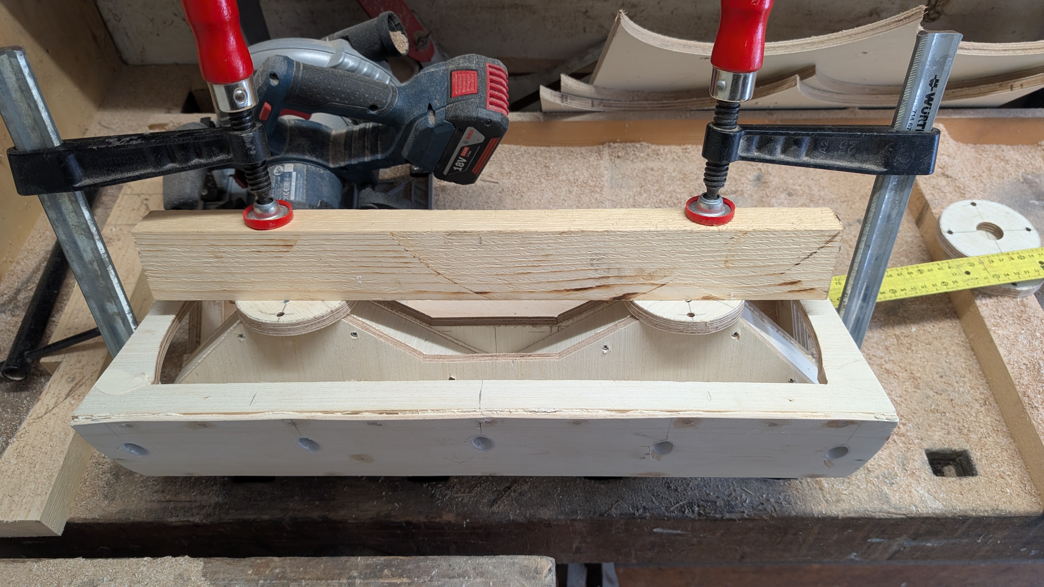Cut everything flush to a sandable distance, filled the holes from my clamping-screws everywhere, removed the glue where it is not needed and so on.