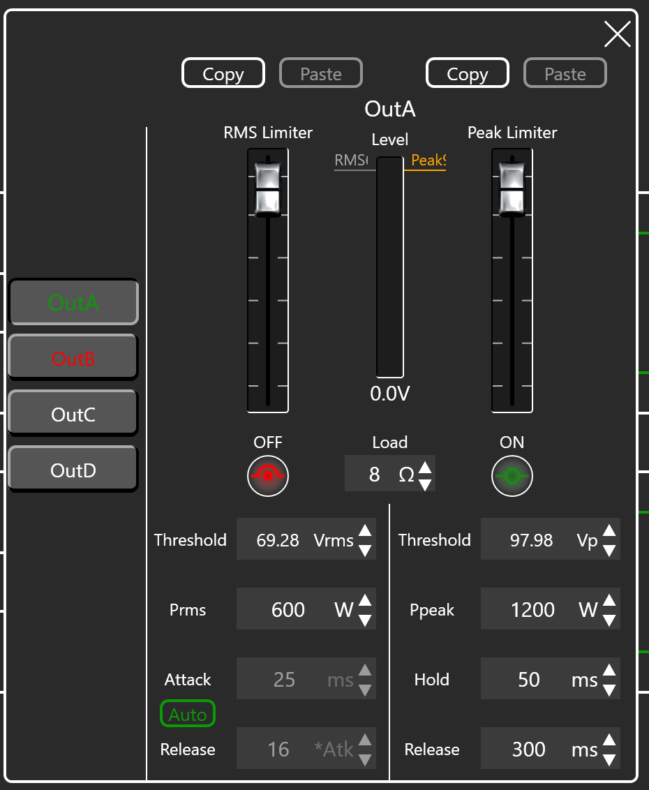 This is how the limiter looks like in the amp interface, it is a wharfedale DP4065F. Would be enough power to have 4 DRS on it, 2 channel for midrange and two for the HF-region.