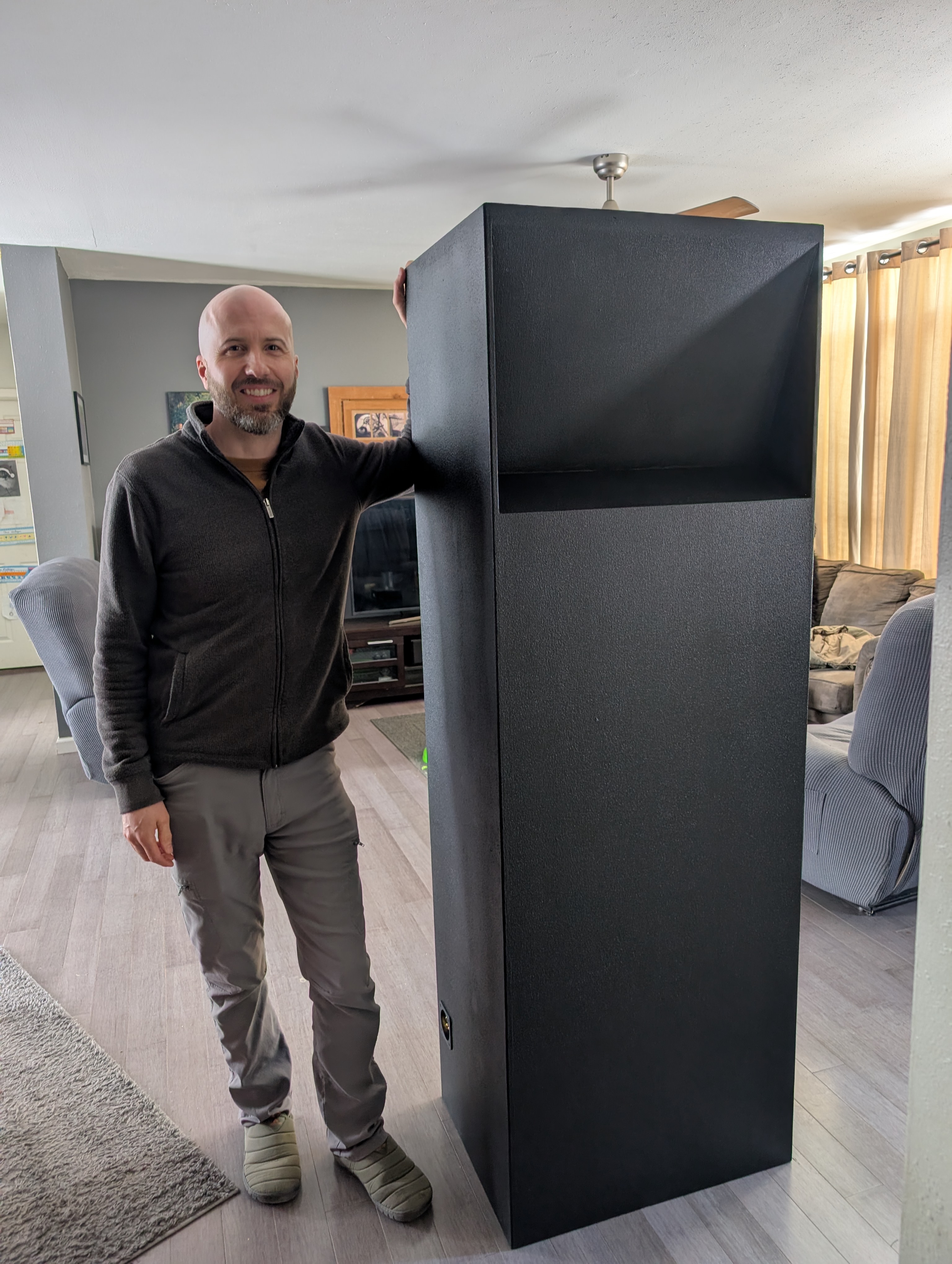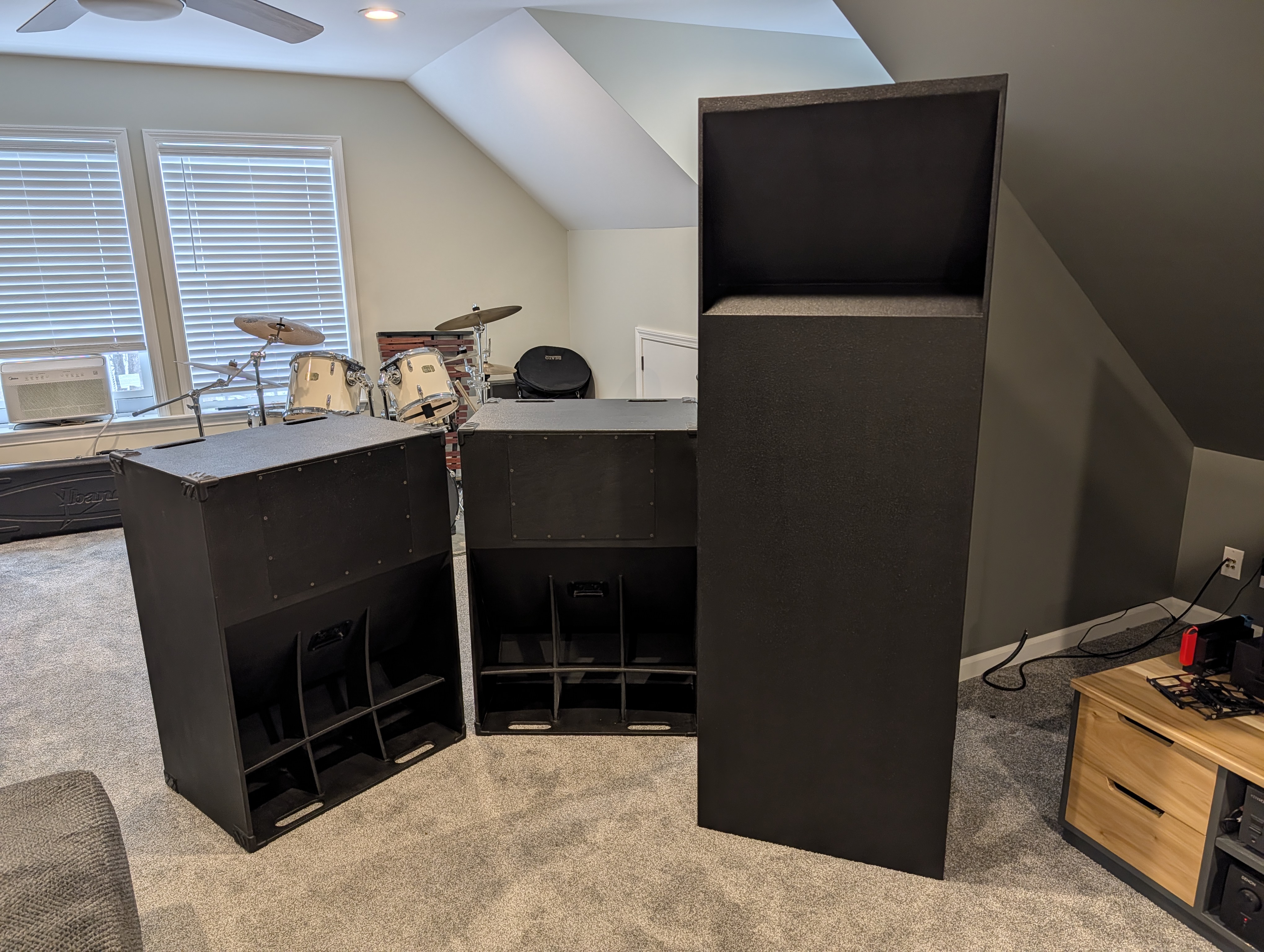 They pretty much dwarf the max width T39's (that are for sale by the way! viewtopic.php?t=26897) I waited to put the drivers in till I got upstairs to make them easier to carry For now, they're both tucked in behind the TV with the mouths facing each other for a bit of coupling. Yes, I realize that there should be more space for proper placement and I wish I had another foot or two of space on the sides to push them out further. Once I got them in place, I regretted not building the front firing mouth version, but that ship has sailed. I plan on turning them with the mouth firing into the corners tonight to see what that sounds like.