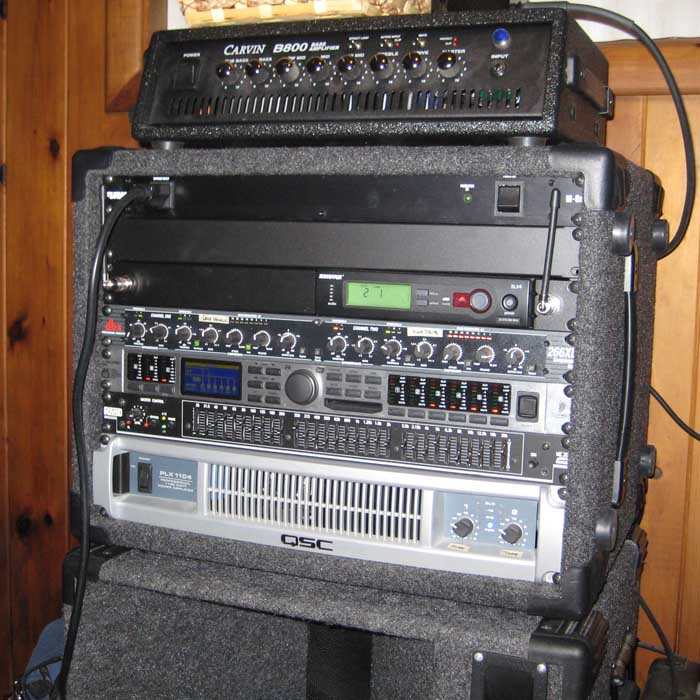 Because of the set-up, the little inconvenience that the large size imposes is off-set by the functionality of the complete system. The 01V will replace the EMX5000, DEQ/DCX combo will replace the light controller, and an XTi4000 will go in the box to power the subs. The EMX will be retired to back-up duties, and monitor duties when needed. The light controller will be going into it's own effects case. The all-in-one box has been planned since 2004, and allows me to set up all the electronics in less than 10 minutes! Plug into my power source, plug in 4 speaker cables, and I'm ready to make noise. It takes longer to boot everything up than to plug up. I have a rack-mounted jack plate on the rear rails, along with a fully adjustable cooling fan system, clearly labeled for sub and mains. My plan is to add a full snake plug for 16 sends and 8 returns, very similar to David Perry's stage snake on a reel. My computer will connect to the 01V using the digital light-pipe TOSLINK, and will handle play-back and instant recording. If my plan works out the way I have it in my head.
