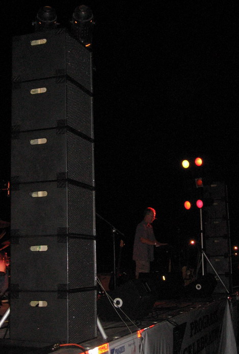 I was running about a 100db at FOH 100ft. from stage. I've done 14 of these outdoor shows this summer with 3 to go and this system works great. Everyone comments on the clarity and when they find out I built it they are really suprised. The last 4 shows I've been running the top 2 box on each side with a aux feed mix for vocals only with a seperate EQ. It really helps bring out the vocals in the mix. The first pic is 8 across the front of stage from a different show which I've done with six also. I can't tell the differance between 6 and 8. I think the spread is to far for 8. Cancellation?