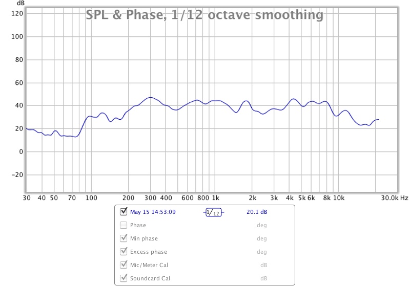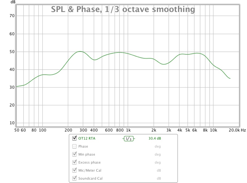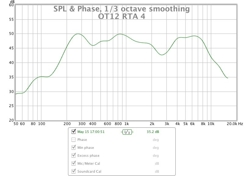 OK...I just took this with the Behringer ECM800 measurement mic going flat into my board, from there via USB to RoomEQ Wizard, set to RTA 1/12 octave, sending full range pink noise with no EQ to the Otops only. I meant to post as 1/12 octave but had trouble bringing that version back. Do those setting sound right and does the chart look reasonable?
