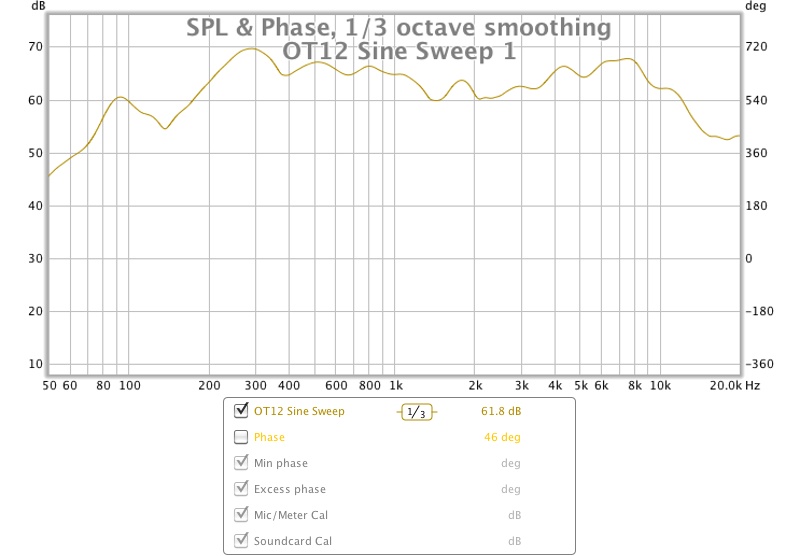 This is another test of one OT12 with pink and sine sweeps. The last measurements inadvertently had the crossover settings on...don't know if that makes any difference or not...