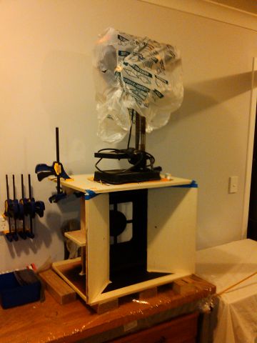 Sunday night and I then was ready to attach it to the top of the assembly, glued, screwed and clamped and a bit of weight for good measure: