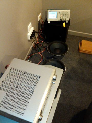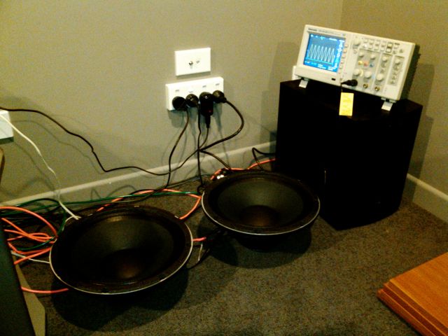 Managed to set-up and break in the drivers overnight on Saturday. Used a program called Audacity (free) to create a 30Hz test tone, converted it to an mp3 using 1411kbps sample rate and loaded it onto an mp3 player. Used my home stereo to drive the drivers, mp3 player as the source and a scope to check the output. The scope is a big overkill I know but I've got it so I use it:
