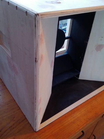 The sides attached, no shortage of screws Gluing the back flanges in place. Can also see the backing plate on the inside right where the handle will go. Corners rounded and bog applied (bit blurry sorry) Gluing brackets to the mouth to mount the grill to later, 12mm from the front edge (blurry again sorry). Resprayed the throat assemblies matte black to tidy it up after all the other work around it.