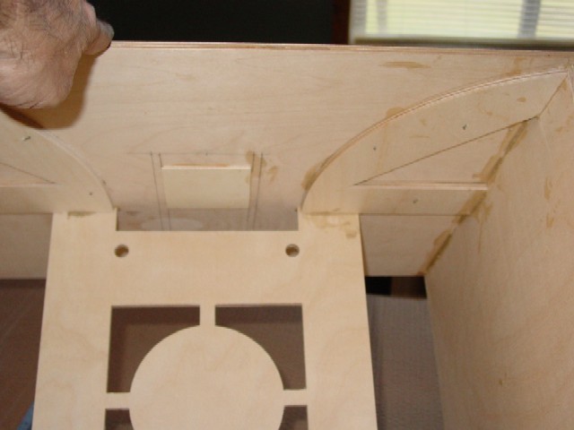 Piece on top is a back brace to the hole I plugged with it's cutout. The hole was in the place the plans called for, which ended up being wrong. Made a new hole in what was the top (now the bottom) for the top hat. Didn't trust the top hat on the other side where the hole would have been moved.