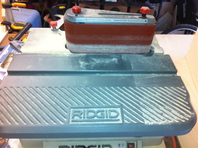 Now you can check out whether the braces are gonna sit in there nice and tight without bowing the back. They needed some straightening, so I made quick work of in on this combo spindle/reciprocating belt sander: