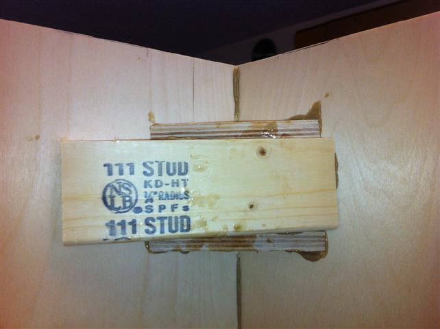 First put in the bottom corner piece flush with the opening. Then the plywood fits on that, then the 2x4 backer, and finish with the other corner on top.