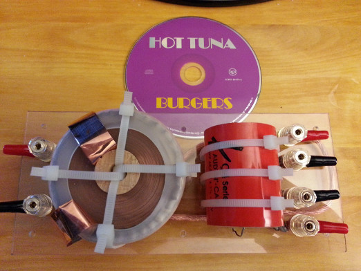 aeolos wrote:Crude but (one hopes) effective: a low-pass filter for an Omni 15 in the 2 12" (4 Ω) configuration. 12 ga. 1.1 mH foil inductor, 68 μF 400V polypropylene film capacitor. An electrolytic cap could have been used for the purpose. OCD manifests itself again. Will be mounted on rubber washers to provide space under the board.
