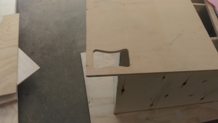 Day 4. Made a lot of headway, would have made more if making my router stencil for the handles wasn't such a task. took me 4 hours to get it right. I got all the way to the top panel on, and I did go all the way to the front, as honestly everyone should. I went the way the plans suggested with my previous build, but its a dirt and dust collector, and holds water (no room under tent for them). I also think it looks unfinished that way, and the handles aren't ergonomic that way. You do save 10" of wood that way, however. I digress. Ahead of me now I just have the backs, refractors, 3 sets of braces (plus side bracing) and the bottom and the side. Oh and I am not cutting out an access panel on the other side, I can reach around the back of the farthest driver through the first one :P Looks cleaner and simpler build. 2" SHCS are THE only way to mount drivers for this reason. I used 10-32