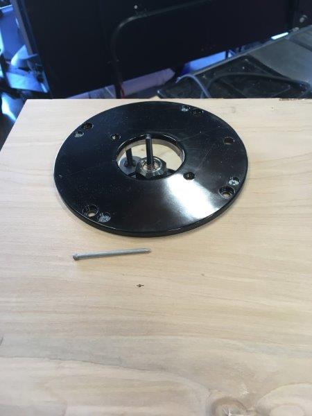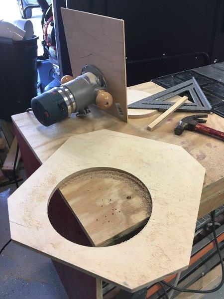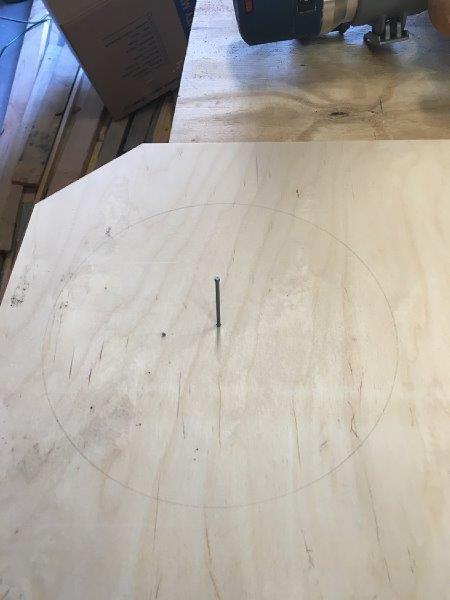 I removed the plastic base from the router and used that as a template on the scrap piece of plywood I am using a a jig. Then I drilled out the screw holes to be able to attach the jig to the router as well as cut out the center for the router bit. I scribed a circle on the baffle using a compass and then started a nail in the center to make a hole to use as a guide when setting the jig. I removed the nail and transferred it to the jig. Finally I double checked the distance from the outside of the router bit to the nail.