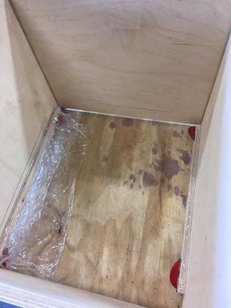 I scraped a little PL away from the joints where I would be installing the vent ports so that they would sit flush against the walls of the cabinet. I installed the vent ports and used finish nails to hold them in place while the PL cured.