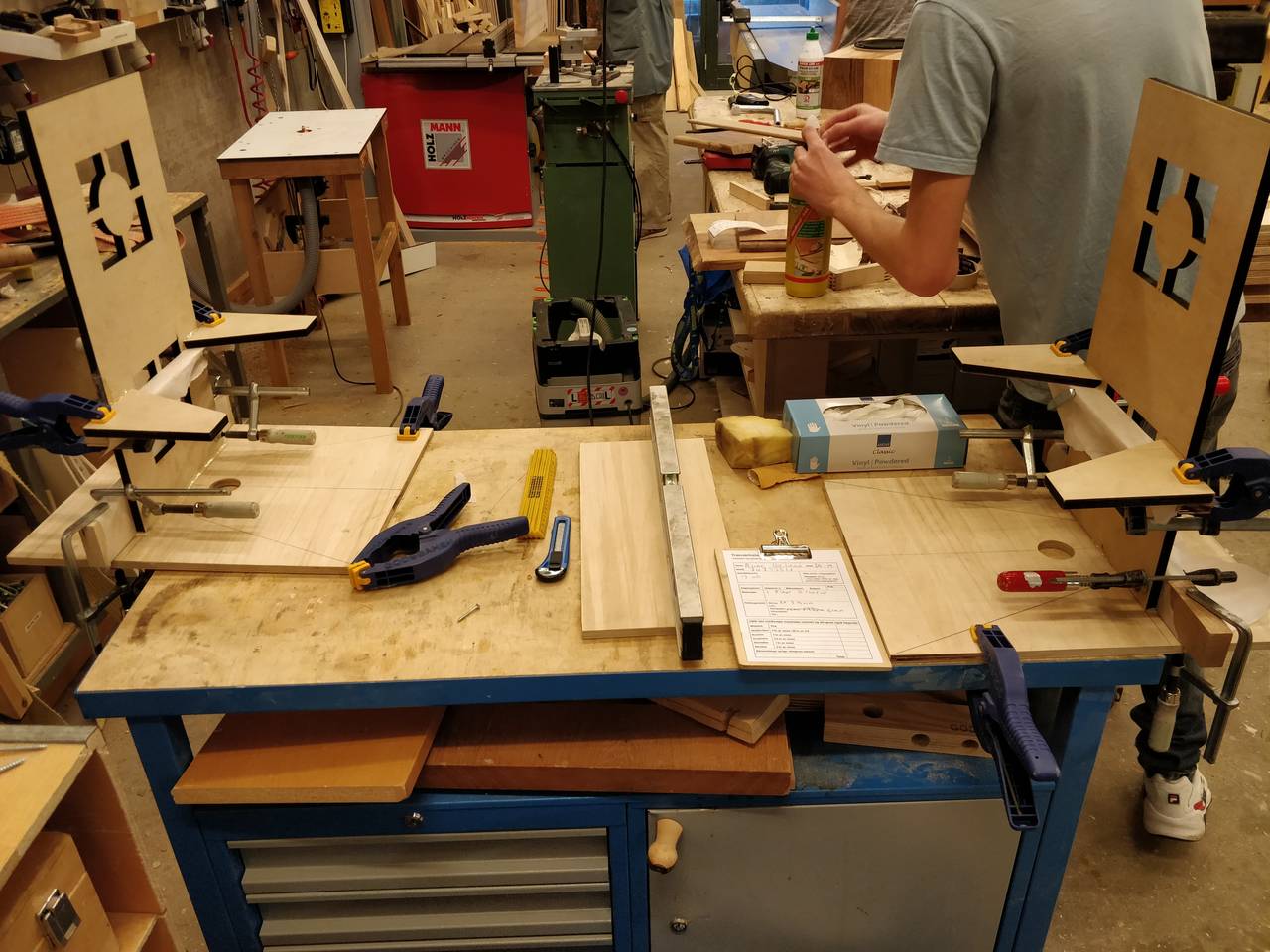 So we were ready to get going, and first was cutting the top/bottom pieces. The plywood was bought in the workshop, and it's of really nice quality!