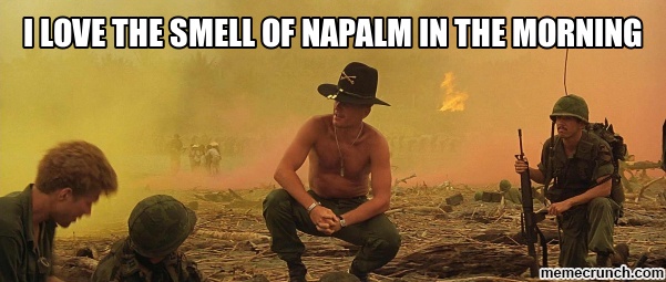 Yeah, there's nothing like Wagner to get you in the mood for death and destruction. But the scene was pure bullshit. You could hear even one Huey approaching from at least five miles off, let alone a squadron. There was no such thing as surprise attacks with UH-1s.