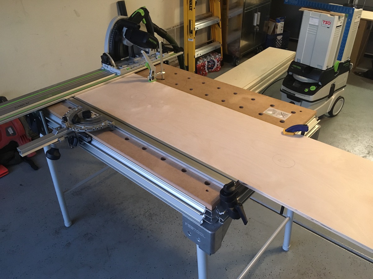 Got all the 1st pass cuts on the interior panels for Cab #1 complete using the MFT cross-cut jig. The jig has a lot more parts to initially assemble and square up than the guide dogs, but once in place, is subsequently less fuss. Working out very similar to a radial arm saw from that point forward.