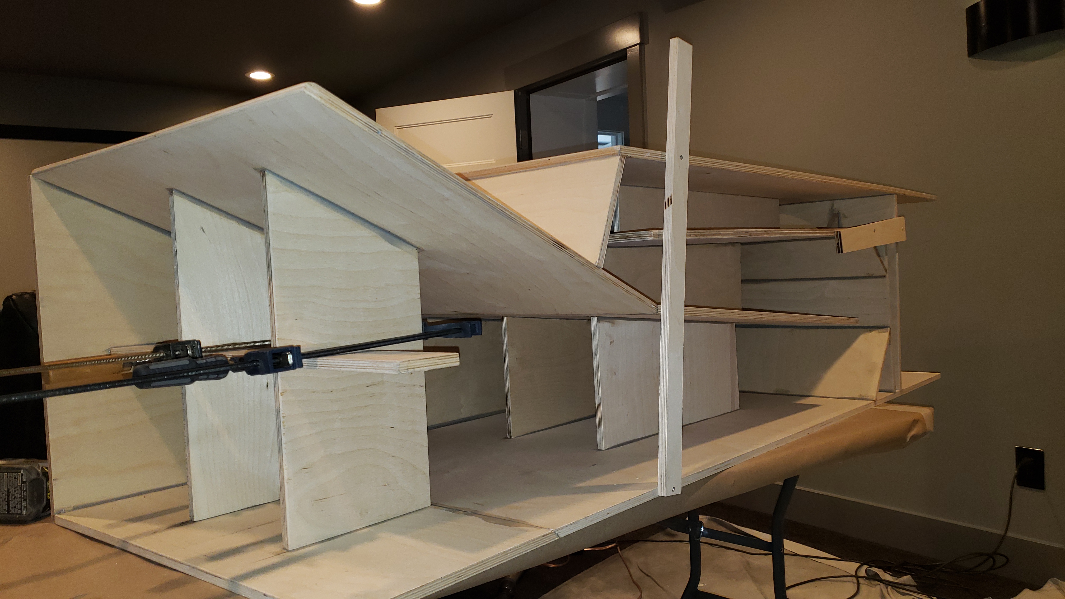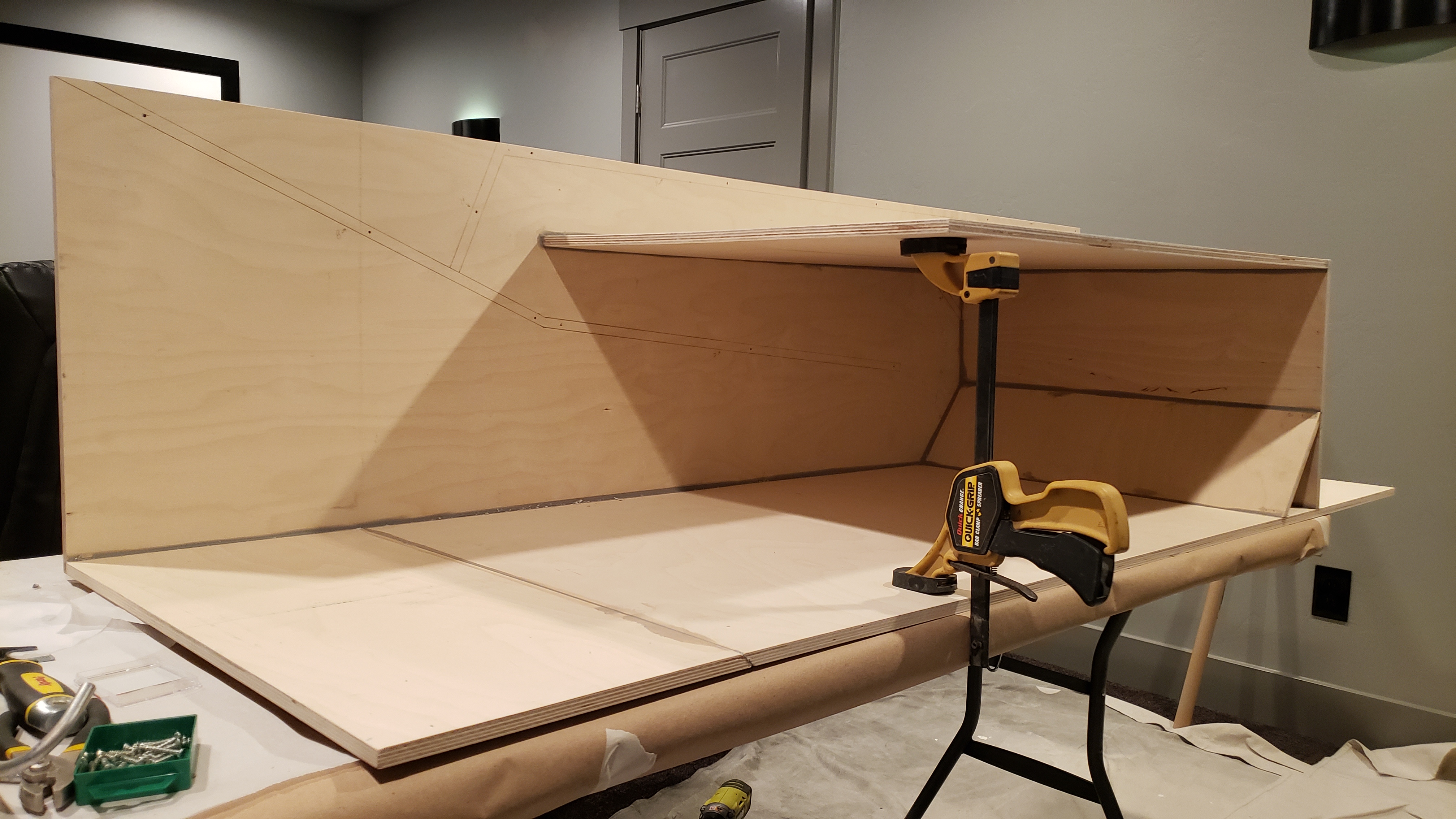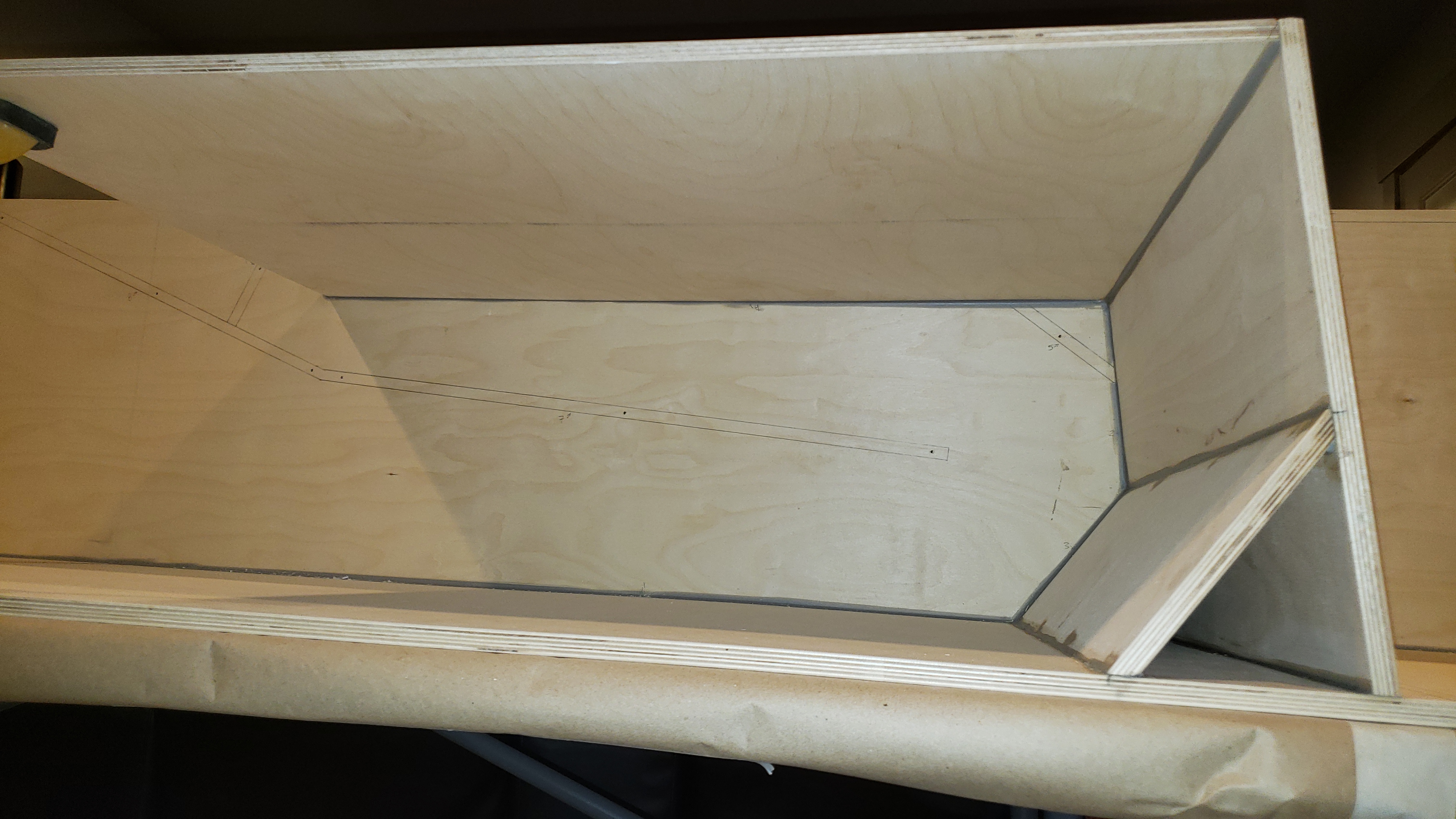 More progress last night. Panel three was tricky. I clamped a carpenters square in the woofer area behind panel six. Then I temporarily screwed a square scrap piece in the place of panel four. That squared everything up to install panel three. I fastened it with a screw through the side and one inch brads into panel one and panel two. I'm not a huge fan of the jigs... I dry fit everything with screws first before I glue. You can see in the pics that panel three was about 1/8 inch off from the line on panel two. It would have probably really thrown me out of square if I had followed the lines. I'm glad Bill makes a note of this in the plans... I probably would have just followed the lines and been out of square. I like the PL Premium Max. I don't think it expands quite as much as the original PL but I'm seeing expansion.
