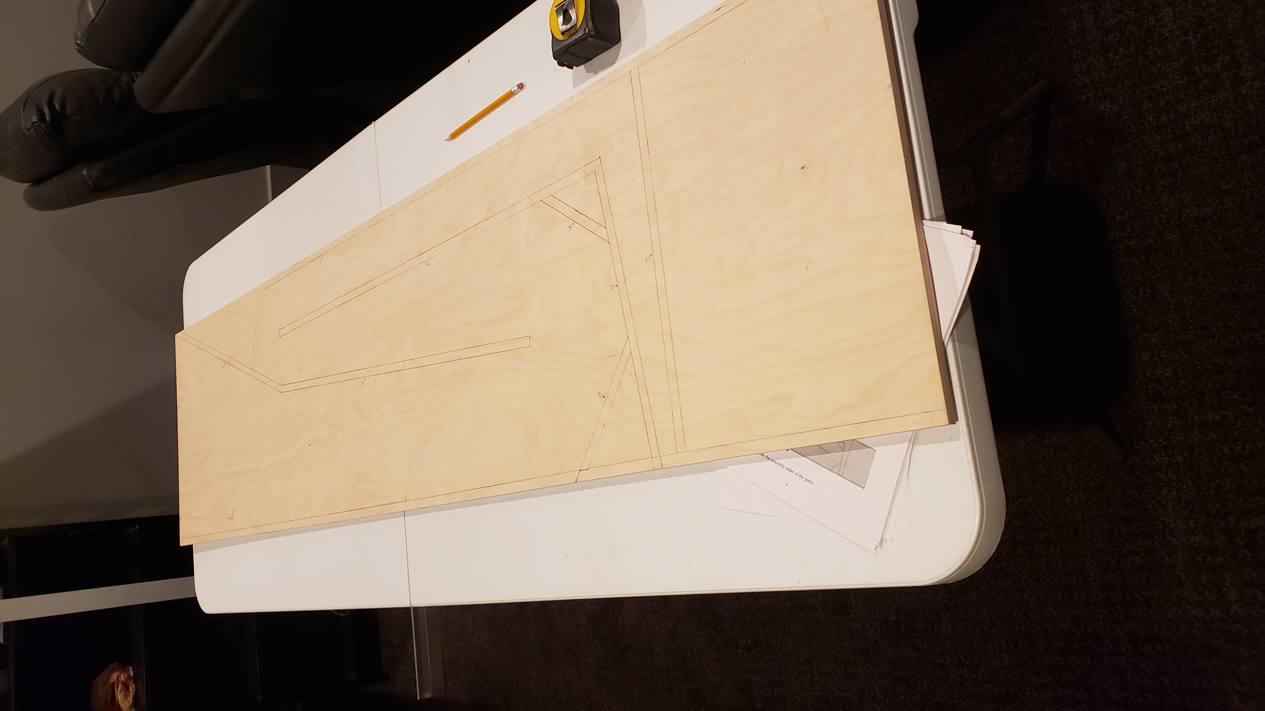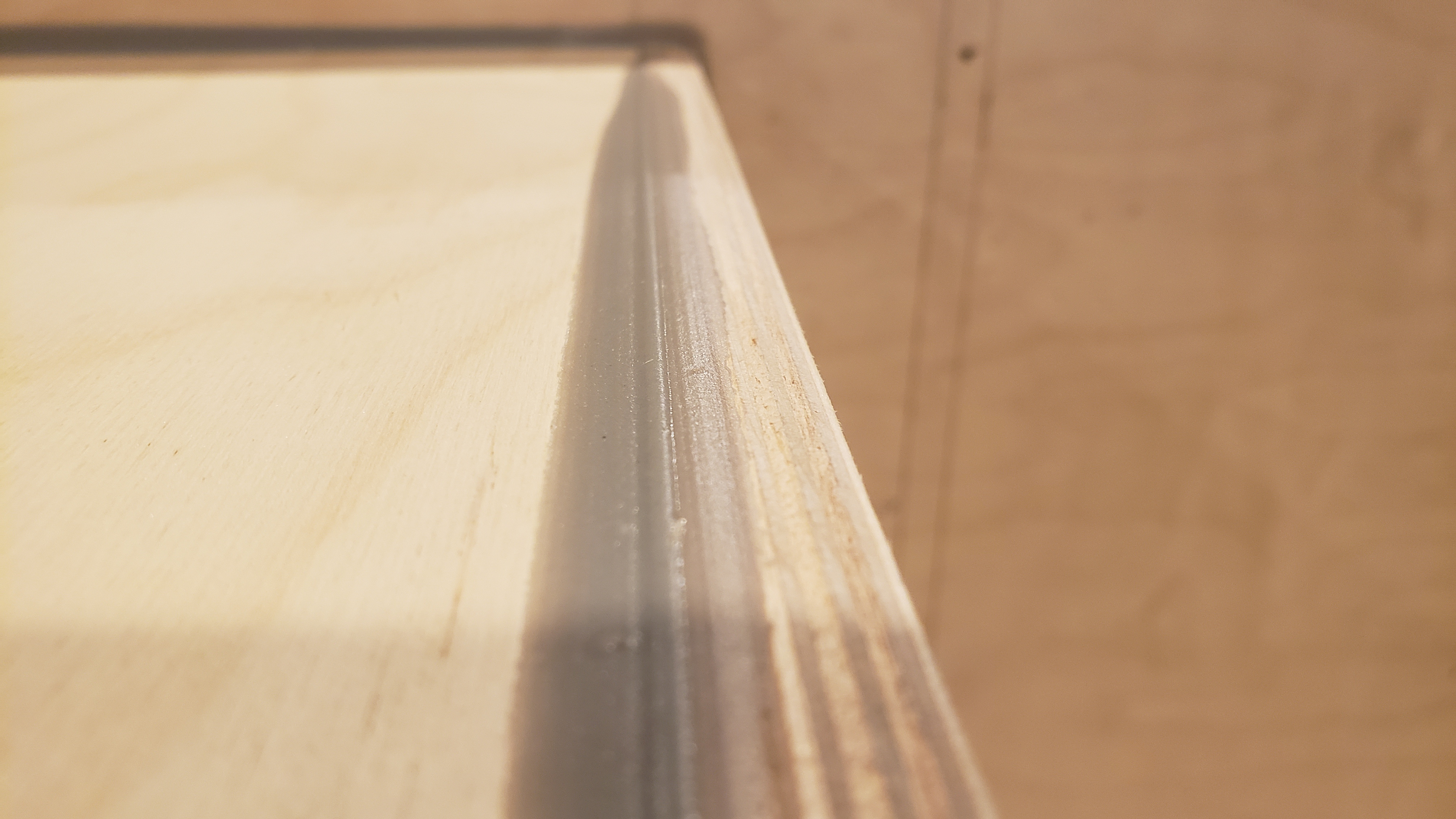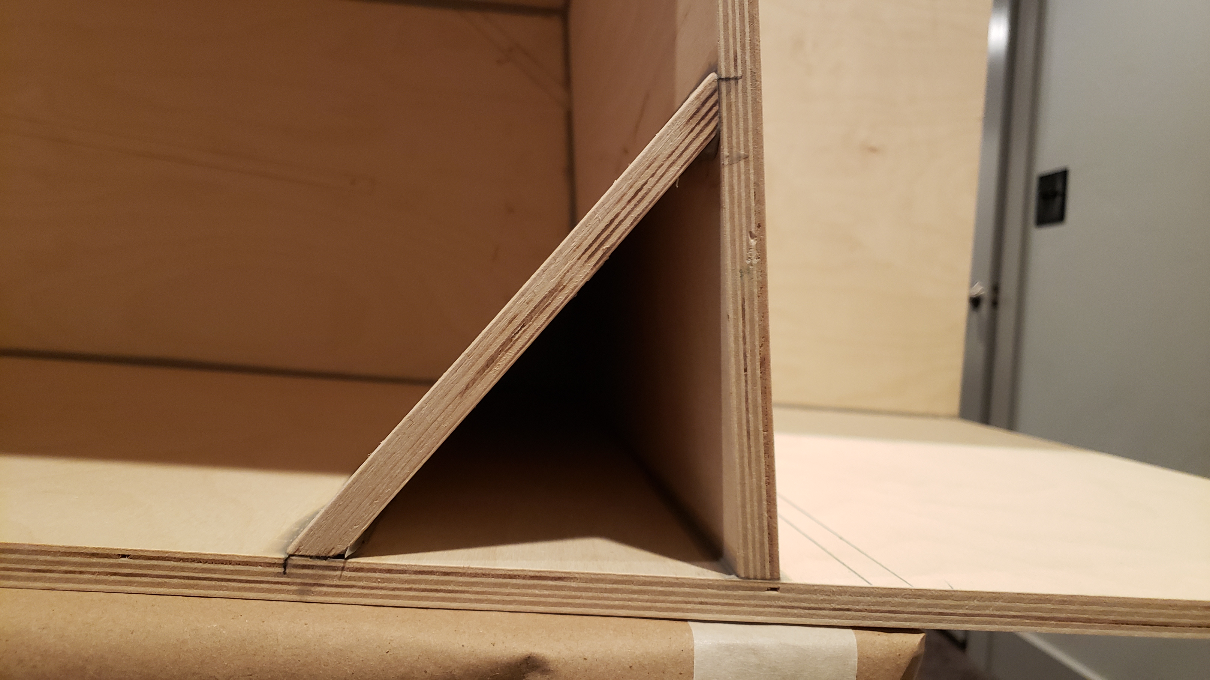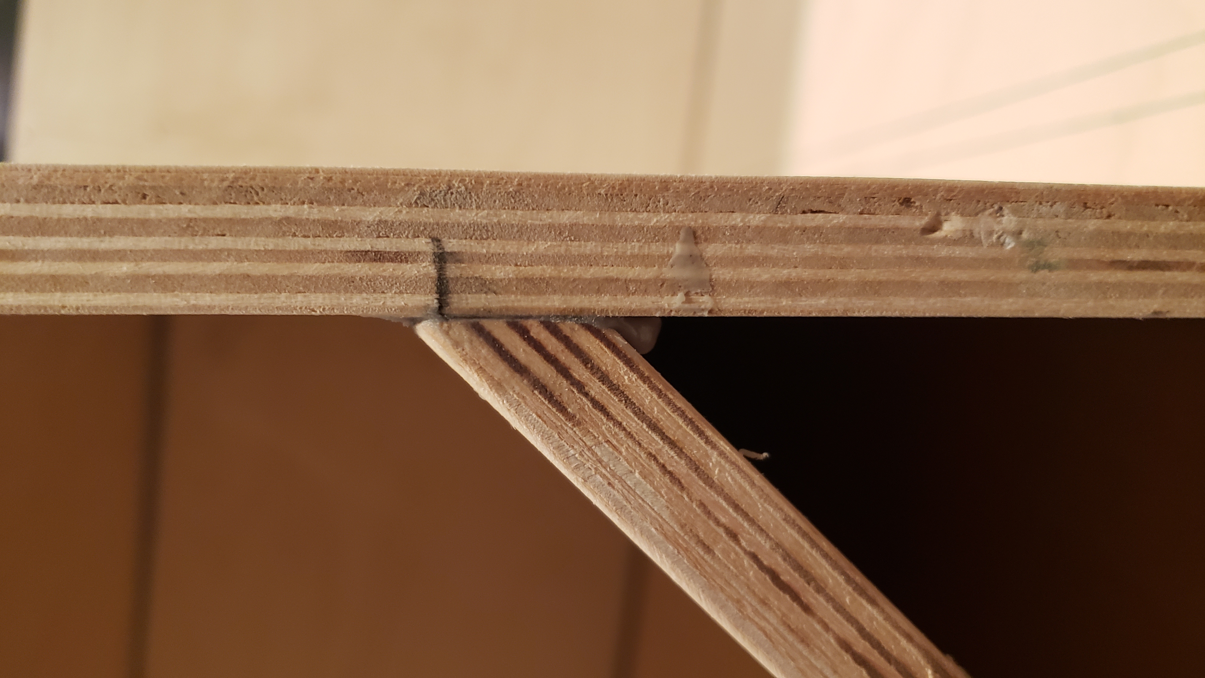 More progress last night. Panel three was tricky. I clamped a carpenters square in the woofer area behind panel six. Then I temporarily screwed a square scrap piece in the place of panel four. That squared everything up to install panel three. I fastened it with a screw through the side and one inch brads into panel one and panel two. I'm not a huge fan of the jigs... I dry fit everything with screws first before I glue. You can see in the pics that panel three was about 1/8 inch off from the line on panel two. It would have probably really thrown me out of square if I had followed the lines. I'm glad Bill makes a note of this in the plans... I probably would have just followed the lines and been out of square. I like the PL Premium Max. I don't think it expands quite as much as the original PL but I'm seeing expansion.