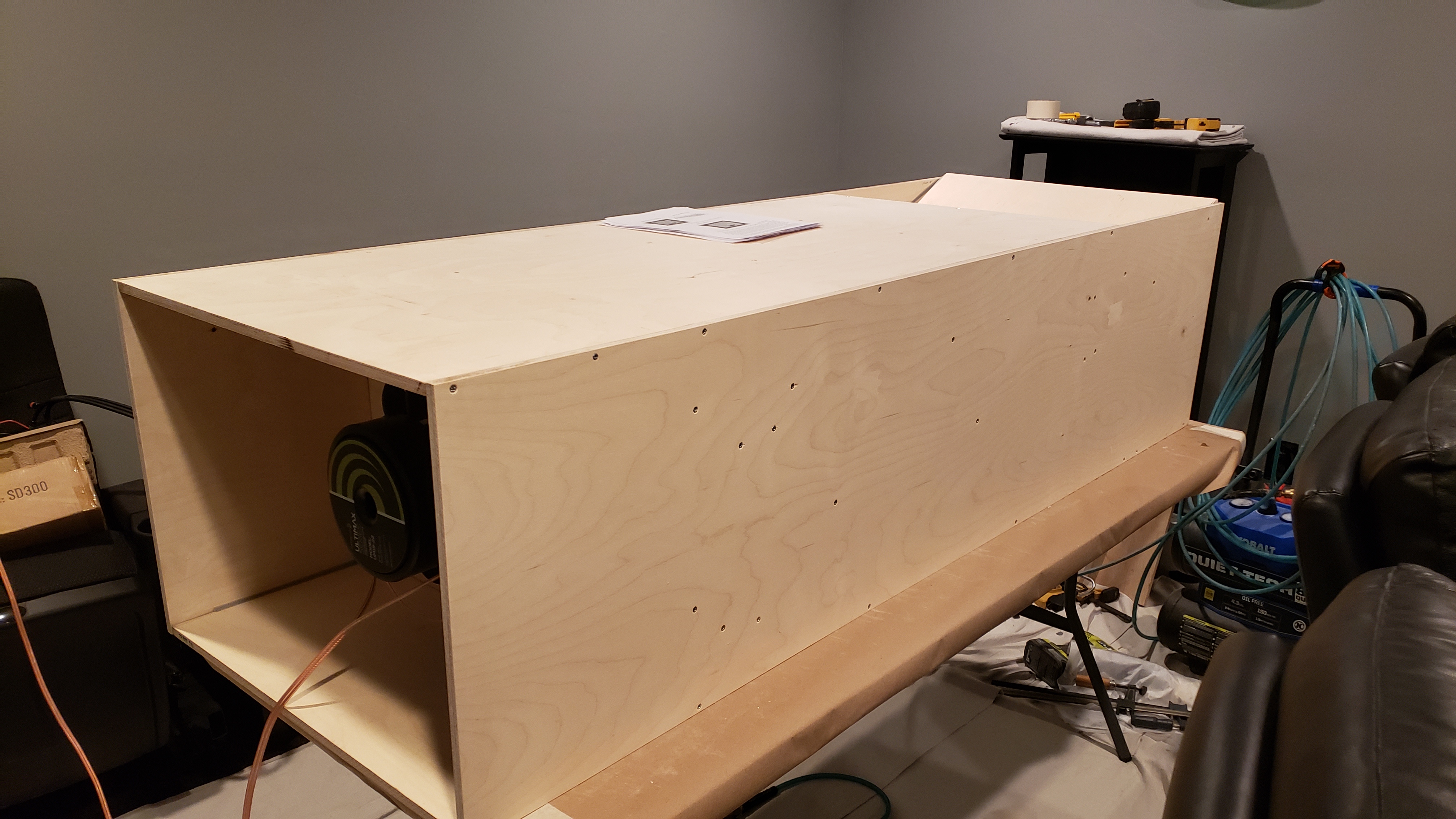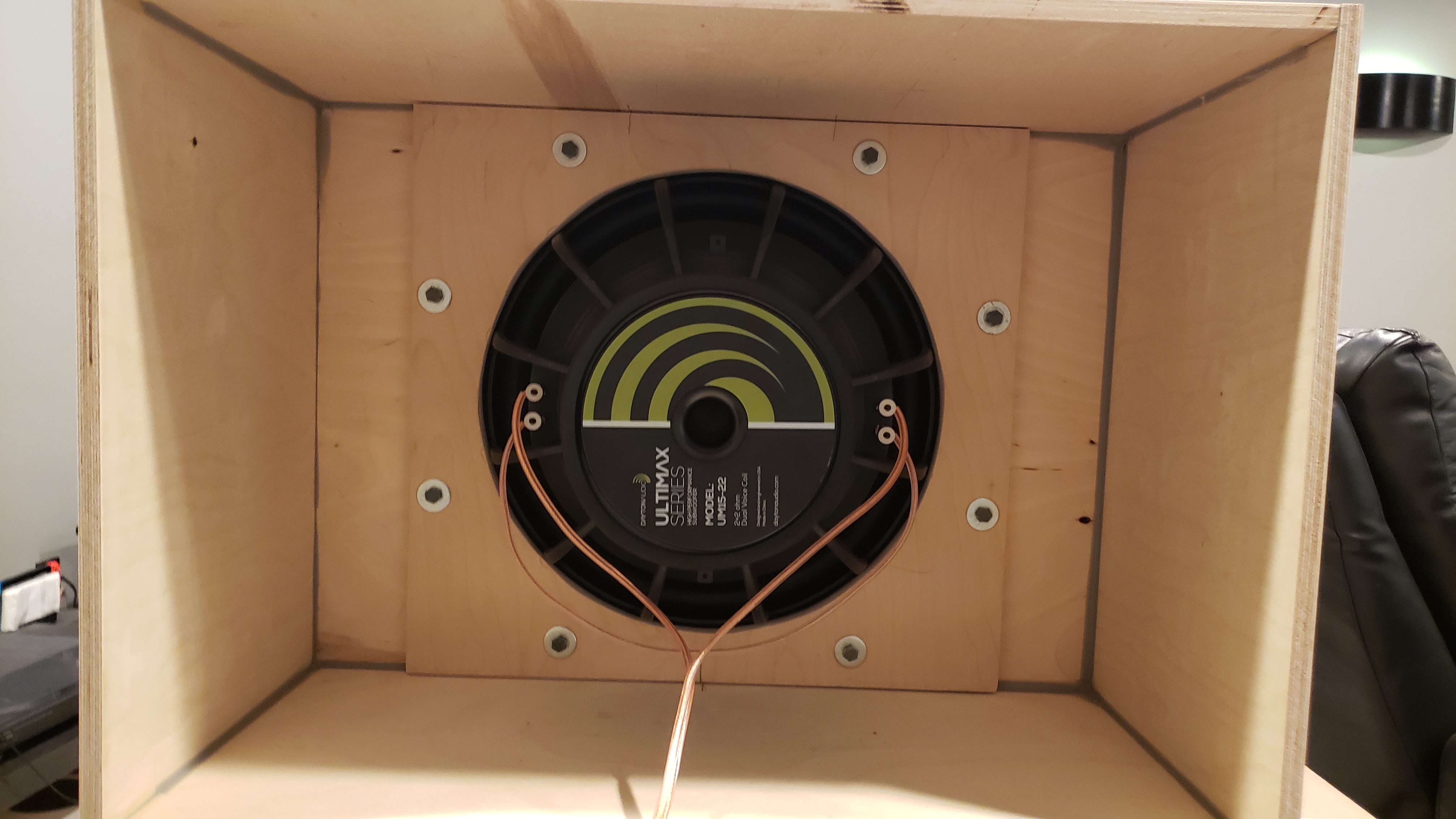 I have the majority of it together. I still have all the work to do on the chamber braces, cover, etc. I had to space my 2/6 braces pretty far apart. The rubber surround on that dayton ultimax is no joke! Even with them spaced apart I still had to notch them pretty deep and taper them with my sander. I decided to use t-nuts to attach the driver plate to panel 6. I like the idea of being able to torque bolts down and not worry about screws stripping the wood out. I also made the driver plate larger than what the plans called for because my panel 6 hole ended up fairly large after adding 1/4" to the speaker cage size. I'll have some tricky work with the chamber braces but I think it'll be okay. I ran it very briefly last night. Very impressive! (even without the chamber sealed) Here's some pics... sorry, they don't really end up in any order.