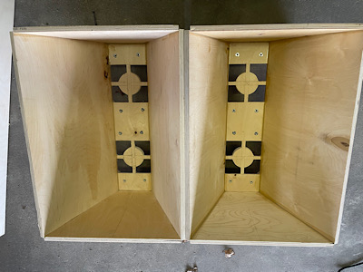 Test fit all the driver hardware, before glueing the top and bottoms, glued top, bottom and horn sides. I did the horn to side braces after the fact, so I could trim to fit.