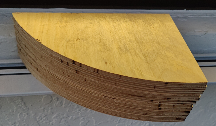 Very slow progress. I work outside, and only when I get a chance so I try to use as few tools as possible. Today was primarily the table router. I had previously cut 12 horn braces. Cut the remaining 8 today. Used the method in the plans to cut one throat sheath brace from a circle made of 1/2" radiata pine plywood that was left over from making the woofer spacers. I used it as a template to make 9 throat sheath braces from 1/4" BB. Partly this was to use less BB, and partly it's because I found cutting the horn braces pretty easy with 1/4" it wasn't necessary to rough cut the pieces with a jig saw as I would have done with 1/2" or thicker plywood. However, with the very small throat sheath braces I found the router a bit more difficult. I think this is mostly because tape I used to attach the BB to the template works better on a big piece. With the big pieces I could re-use the tape for three or four braces before replacing it. With the small pieces I found out the hard way that I could only get one or two uses from the tape. After that it did not hold firmly enough. So... to get 9 good ones (8 plus a spare) I made 12 attempts. It saved a bit of wood, and was still pretty easy.