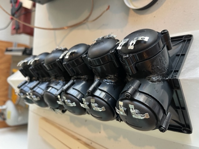 Moving along, got the tweeter array together and am planning on glopping on more acetone + plastic over the next couple of days. Starting to think about how to power these things....I have a couple of home amplifiers sitting around and a bluetooth adaptor. I'm thinking....some kind of eq or dsp thing (?) in between the bluetooth and the amp and I'm set. It's for the garage and judging by the spl charts I won't even be running 1 watt into the Otops (like maybe ever?) The dream would be to have a driveway party and some music...but again, the efficiency is so ridiculously high it won't take much power. And I live in a retirement community so blasting super high volume might get me kicked out of the neighborhood.