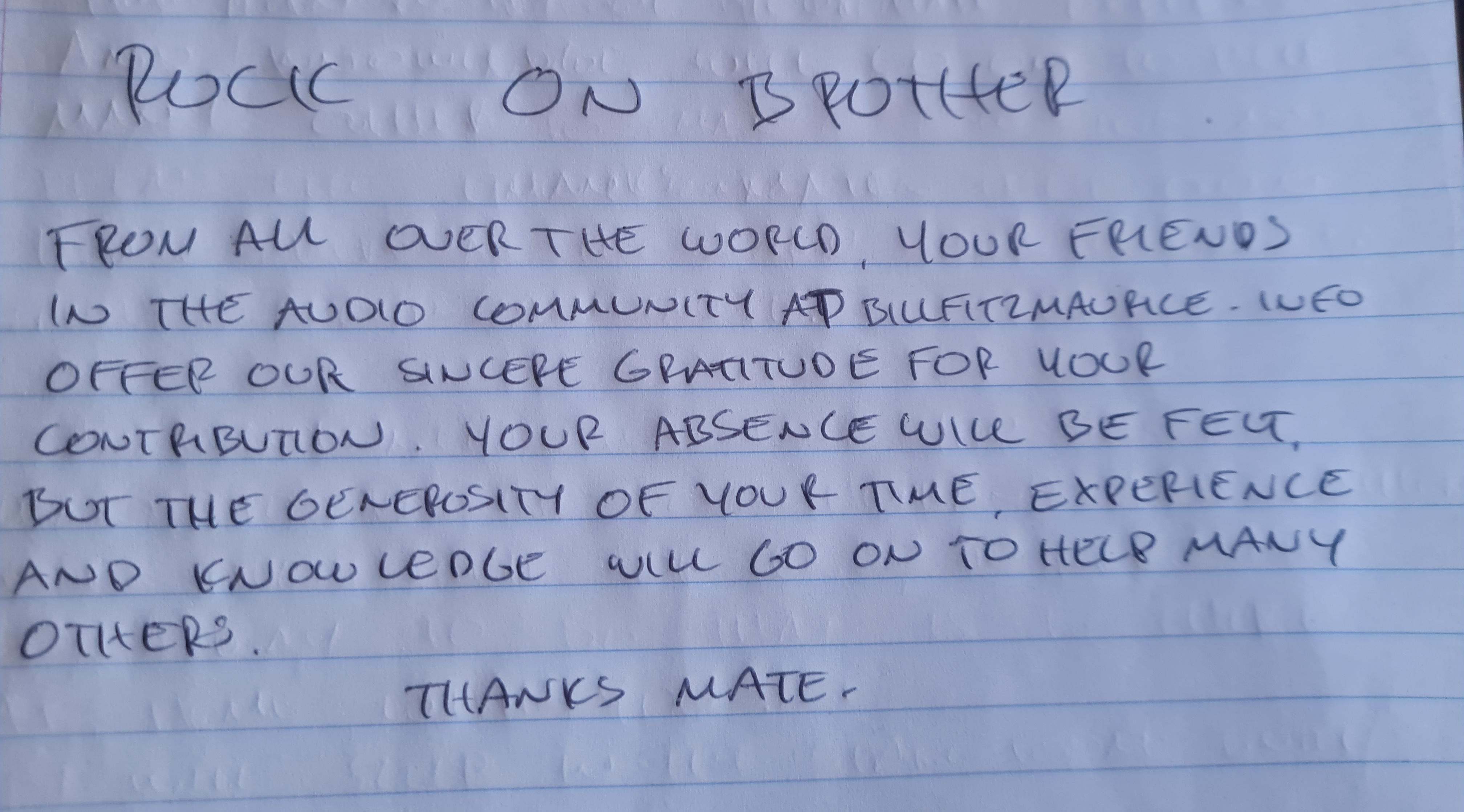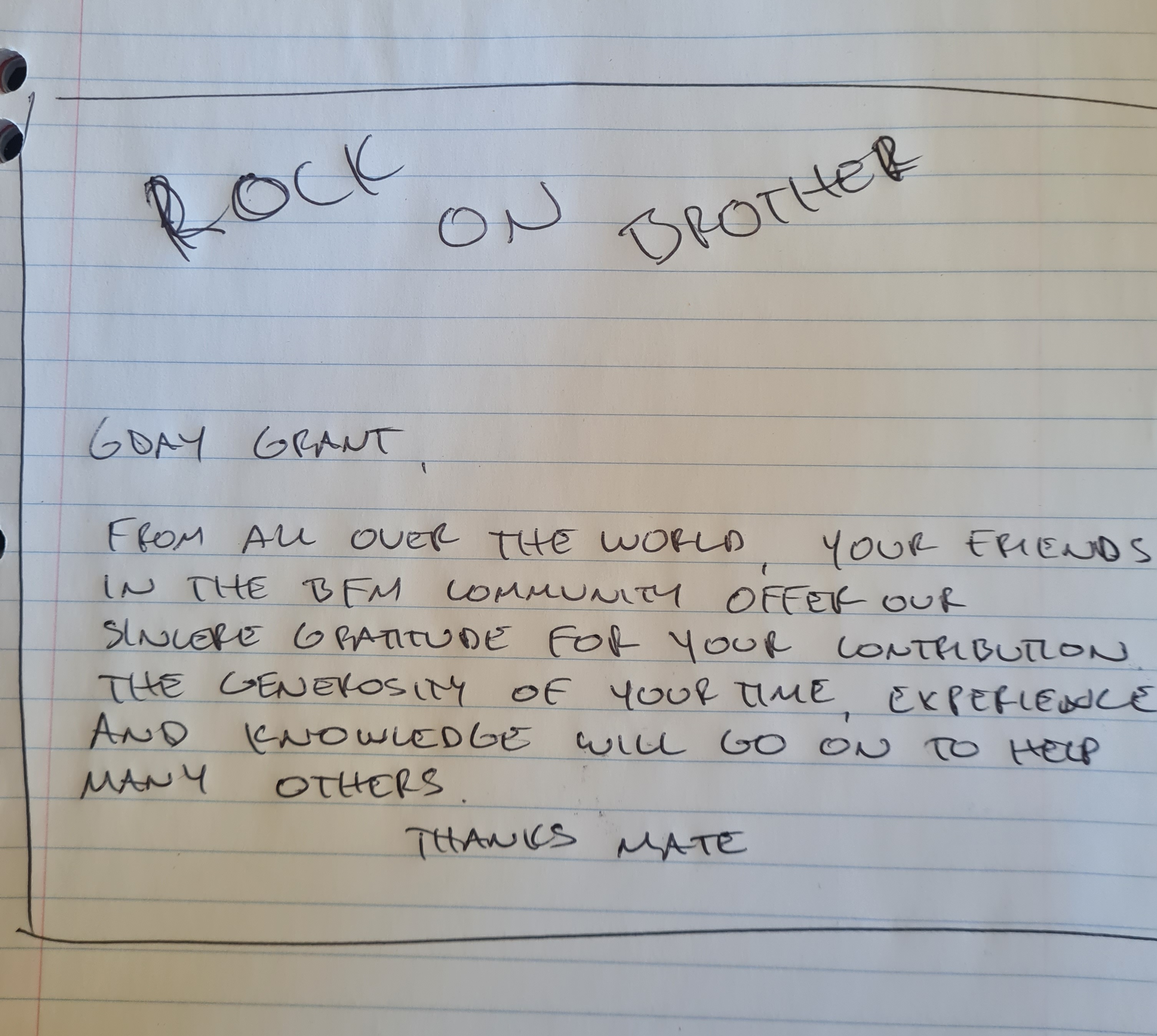 I'm thinking a message from us on A3 size high quality paper/card inside a picture frame, set as landscape orientation. I have a friend who is a wicked artist and can whip up something simple for us. I like Rich's "Rock on Brother", that could be in a larger font at the top, followed by a brief message underneath, two lines at most I reckon.. thoughts on the message..? Something like "From all corners of the globe, the BFM community offers our sincere gratitude for your contribution..." I don't know.. too formal?