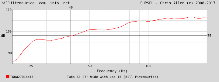 Since their apples are rotten, we can't really compare unless you want to use rotten numbers too. I'd rather not, but why not? Let's see what a load of bullshit useless figures equates to. Using 107dB sensitivity (highest I see on the plot) and 1200 watts (LAB15 peak power rating) equals 137.8dB of bullshit 27" wide 1x 15" loaded T60 max SPL.