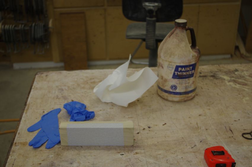 I am wet sanding these, so I need paint thinner for the wet part, gloves (paint thinner is not as bad as other solvents, but still not good - and it would not get the PL Premium off of my hands) and lots of paper towels.