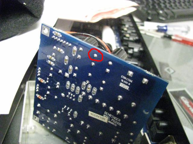 De-solder the circled piece and insert a longer piece of wire that will reach the bottom of inductor. Solder to the board, solder the 2 ends together, and test.