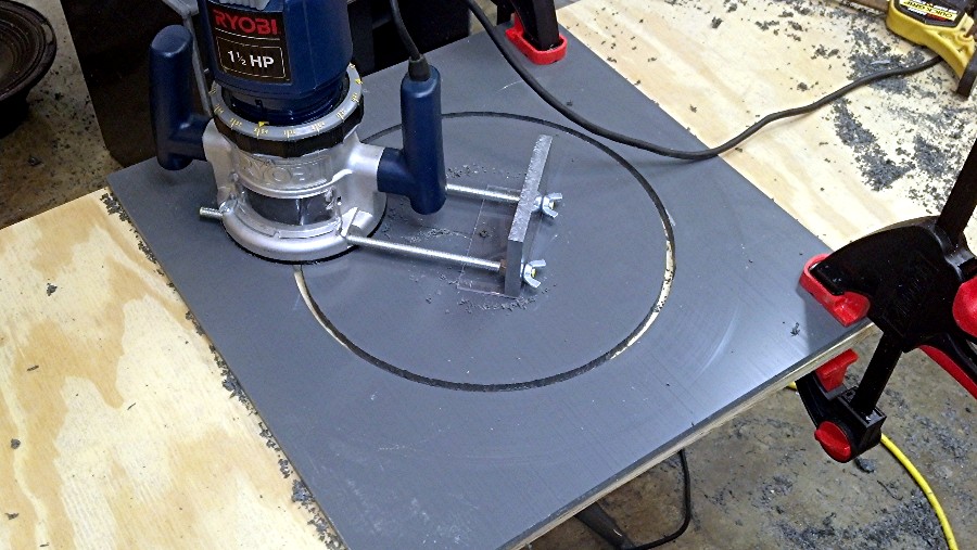 I do have a really nice looking circle of worthless PVC though. Might just hang it on the wall as a reminder. Routing a circle in PVC is a bit o' fun as well . . . The cutter pretty much melts its way through. It's like plowing a field . . you are turning the material over, but it's a molten stringy gob behind in the furrow. Lots of back and forth to clean out the groove.