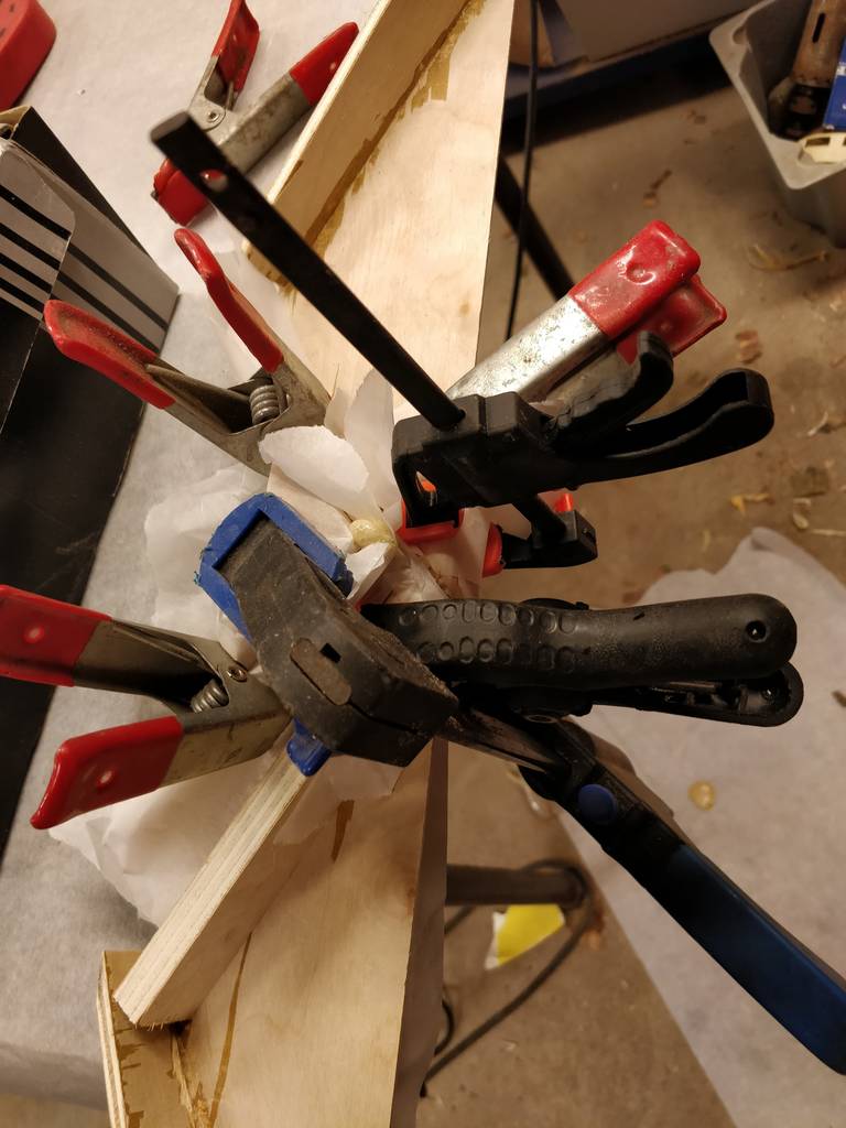 Installing the spacers went quite well. I put them in place, and marked the holes on the baffle. Then I drilled pilot holes and tested if the screws could go in through both layers. I then glued it and screw in the screws to hold it tight. It went quite smooth with all 4 of them. The phase plugs were just hold in place as we had some small clamps that fit through the baffle holes. We then cut the extended parts of the horn. Also I didn't follow the order of the plans - sorry, but I felt that these parts weren't really depending on each other, and I needed to get the glue going, so I could continue working on something else afterwards..
