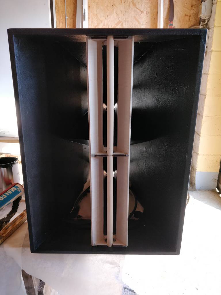 I installed the horn throats of cab #2. It went quite alright. I installed them with the cab lying on the back. Gravity and a tight fit was enough to keep them in place. I must have done something right there.. I sanded the ends to fit, as my saw didn't cut more than 45 degrees. It wasn't 100% smooth, so there was some small holes. Long live PU.. They ended up being super nice. And looking very sharp..