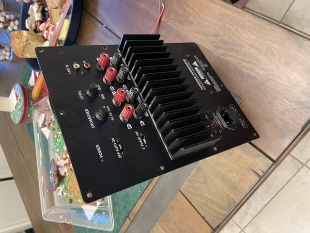 I decided to use the plate amp out of the subwoofer to save money on this build. I clamped it out of curiosity and managed to squeeze a whopping 24.5v out of it. This should serve as a sufficient match to the MCM8”/TableTuba26.5” I am building.