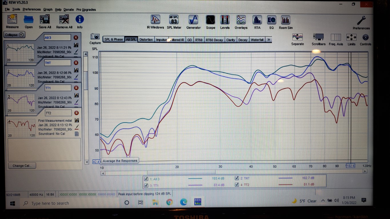The mic showed up tonight. I've never used one and I need to pick up an extension cord. This is measured from about 5 feet off the back wall. The graph has one line for each... TT1, TT2, THT, then all three together.