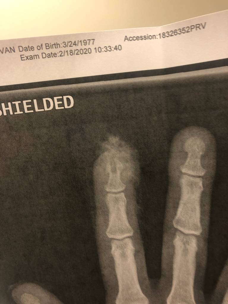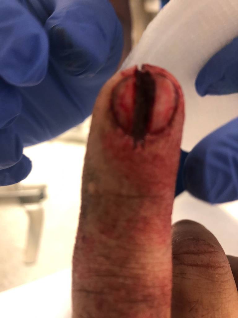 Note the blade pattern in the skin just past the cuticle, same as the leading edge when cutting wood. Also, the x-ray... cut right down the center of the bone! Precision carpentry at it's finest.