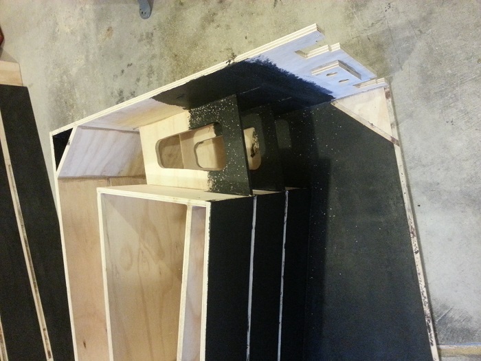 My dad took my brother to Oregon (school) so I worked alone tonight on some bondo and PLing the wires going to the rear speakons. I finished approximately half of the bondo and the rest will be done tomorrow along with install of quarter/half rounds, cutting out of the flanges/access panels, and triple checking that there are no air leaks anywhere.